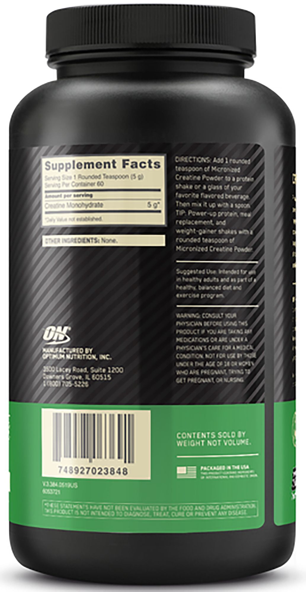 Made with Creapure® (an exceptionally pure creatine monohydrate) Optimum Nutrition® Creatine Powder helps support muscle size, strength and power. In addition, this powder is micronized so that it mixes easily and stays suspended in liquid longer.
