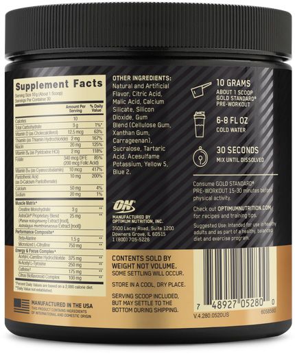 Setting you up for a powerful performance, Optimum Nutrition® Gold Standard Pre-Workout is designed to enhance energy, improve focus and increase endurance. This pre-workout contains Acetyl-L-Carnitine HCI, N-Acetyl-L-Tyrosine and muscle matrix that includes AstraGIN®.