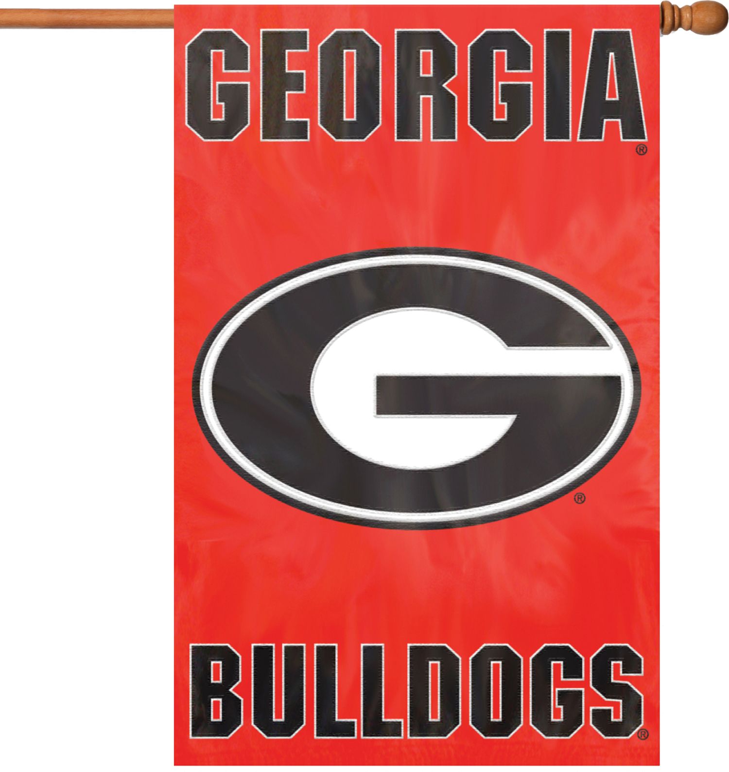 Let your team spirit soar with the Party Animal® Georgia Bulldogs Applique Banner Flag. This durable, oversized flag features hang tabs for easy attachment to a flag pole and a quality team applique embroidered on each side. The team banner flag measures 44” x 28” and is made of weather-resistant nylon. Show the neighbors you’re a Bulldogs fan even in the off season with the Party Animal® Applique Banner Flag.