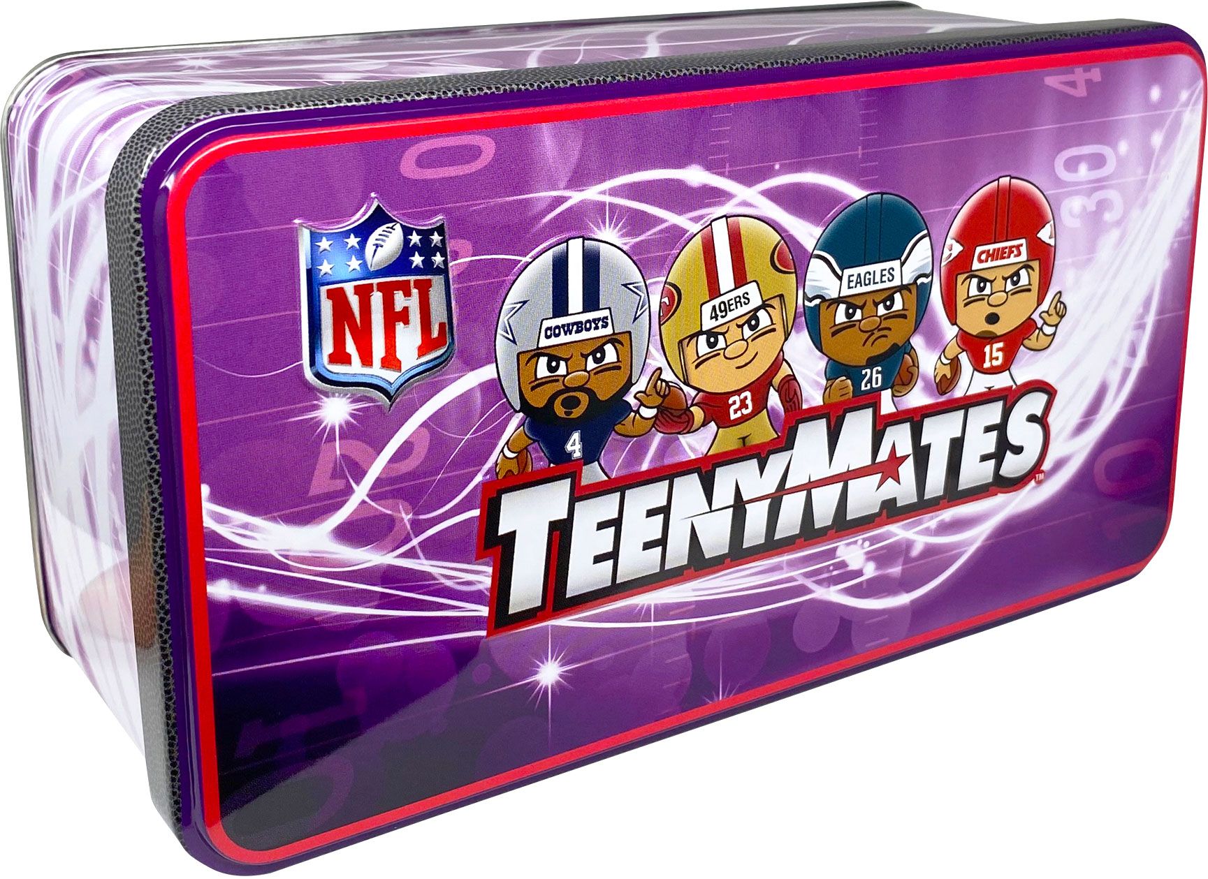 Show your team spirit with the Party Animal NFL TeenyMates Collectors Tin. This officially licensed product features team graphics and colors, capturing the likeness of your favorite NFL players in TeenyMate style. Perfect for any football fan, this durable collectors tin is a must-have addition to your fan gear collection.