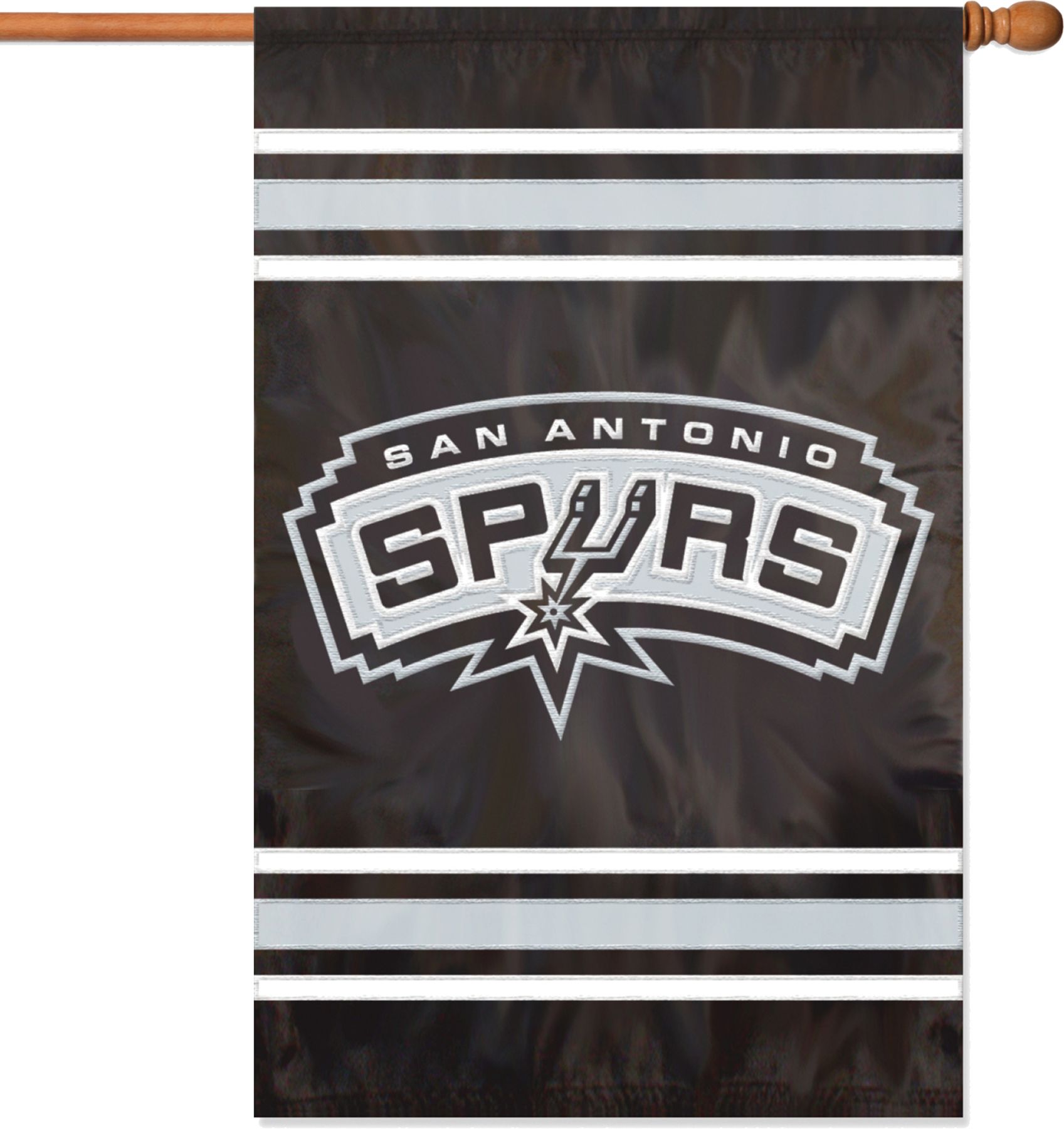 Let your team spirit soar with the Party Animal® San Antonio Spurs Applique Banner Flag. This durable, oversized flag features hang tabs for easy attachment to a flag pole and a quality team applique embroidered on each side. The team banner flag measures 44” x 28” and is made of weather-resistant nylon. Show the neighbors you’re a Spurs fan even in the off season with the Party Animal® Applique Banner Flag.