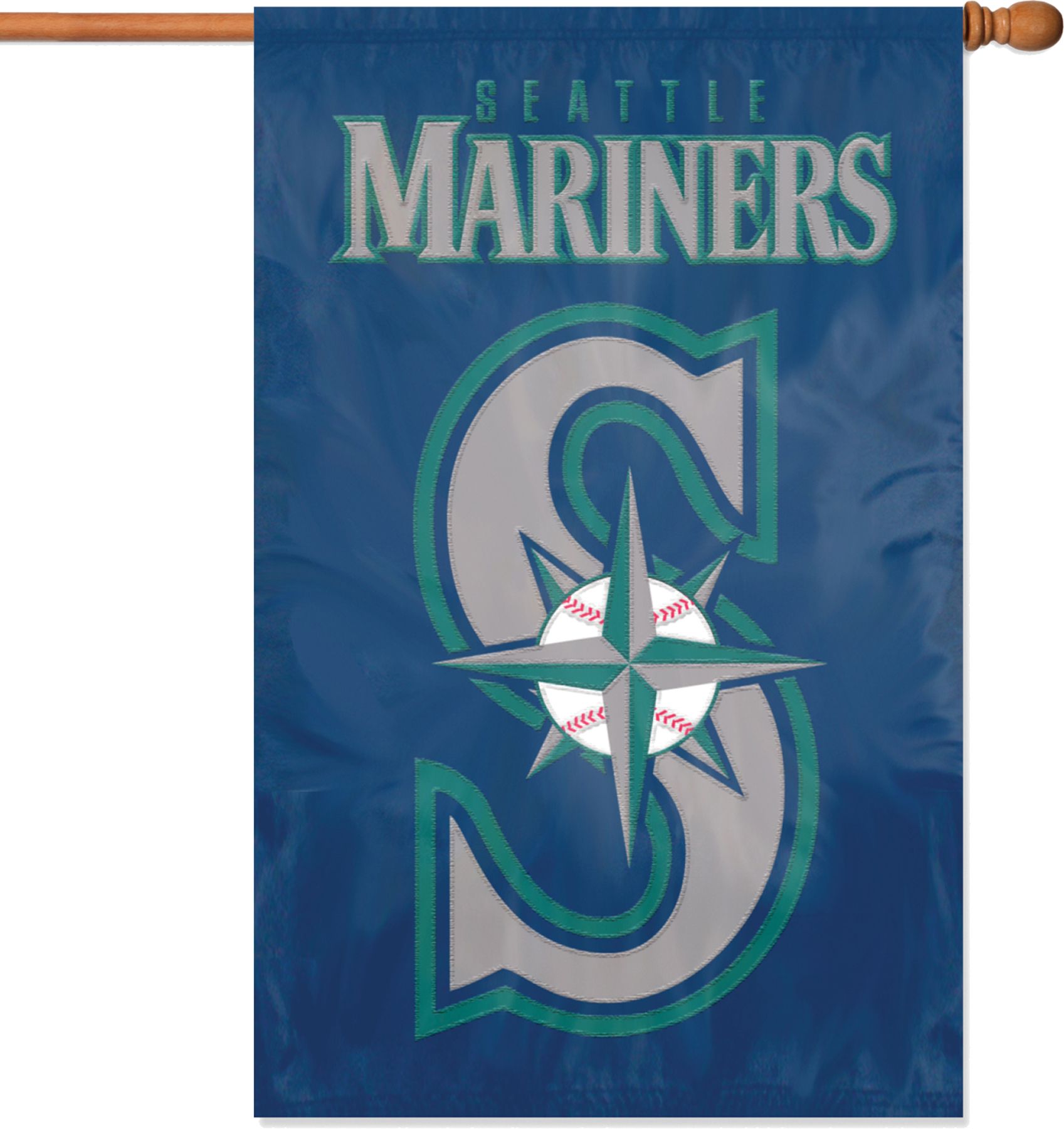 Let your team spirit soar with the Party Animal® Seattle Mariners Applique Banner Flag. This durable, oversized flag features hang tabs for easy attachment to a flag pole and a quality team applique embroidered on each side. The team banner flag measures 44” x 28” and is made of weather-resistant nylon. Show the neighbors you’re a Mariners fan even in the off season with the Party Animal® Applique Banner Flag.