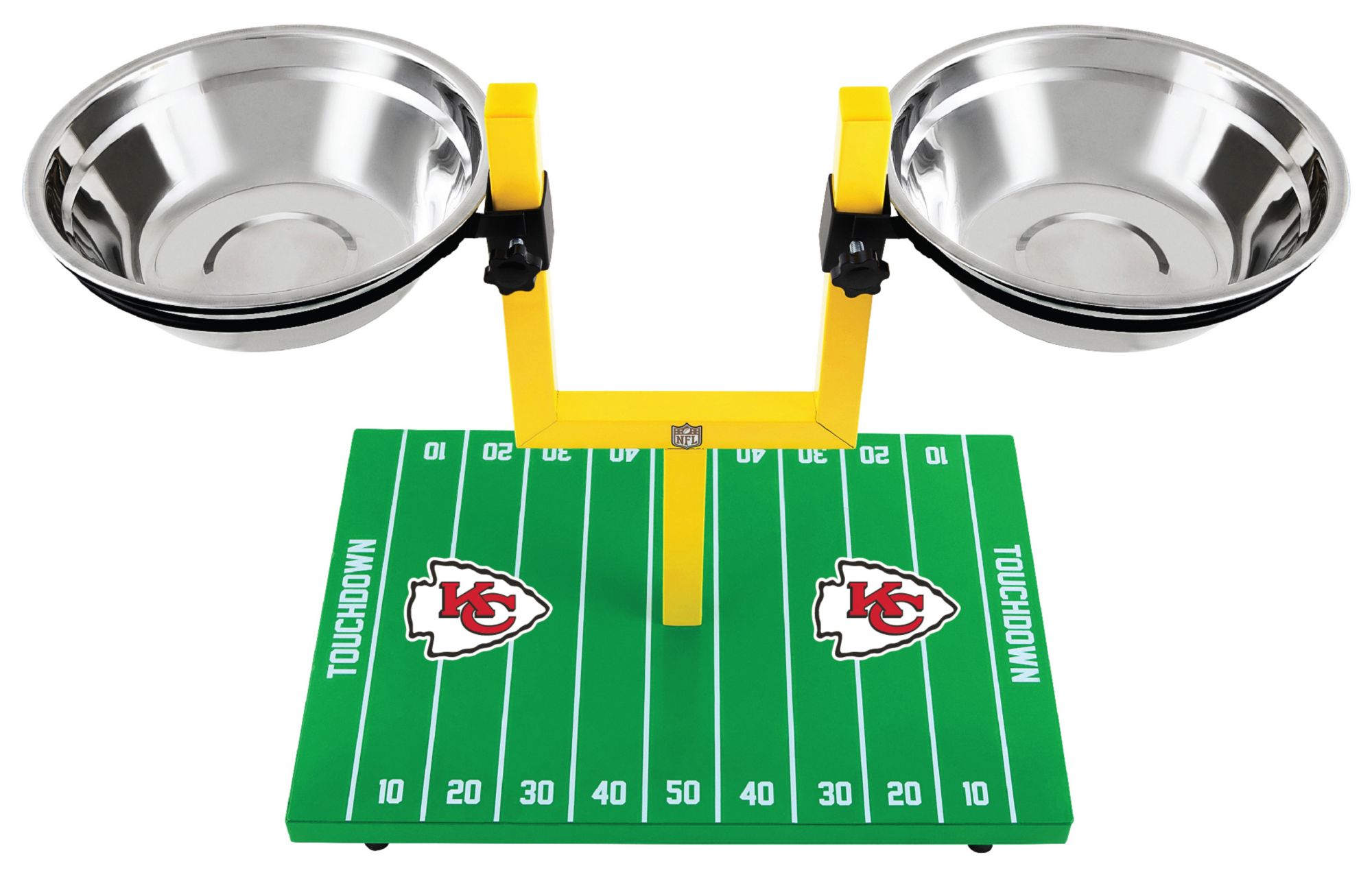 Made of durable materials this feeder comes with height adjustable dual stainless steel bowls set on a non-slip and waterproof football field designed base