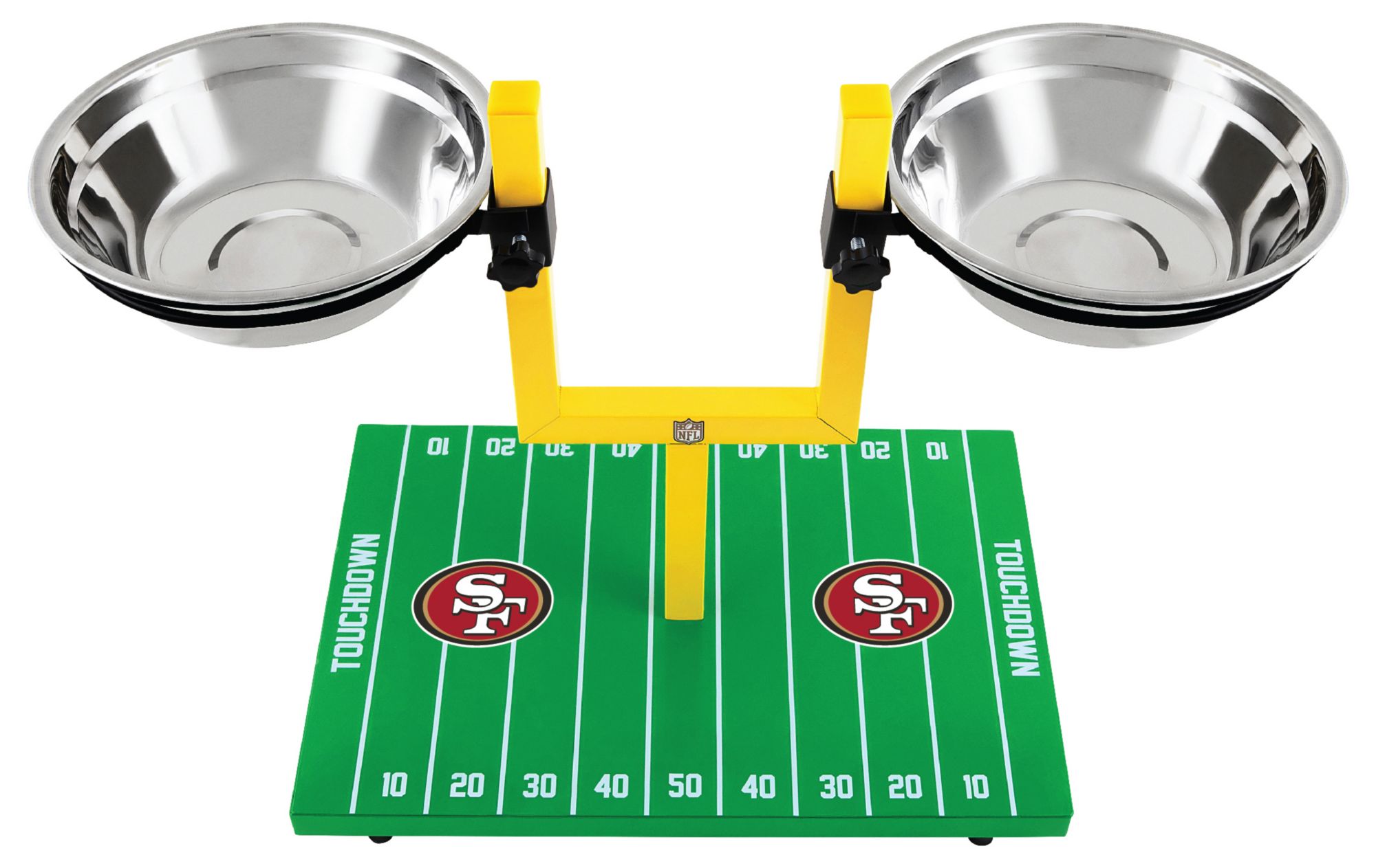 Made of durable materials this feeder comes with height adjustable dual stainless steel bowls set on a non-slip and waterproof football field designed base