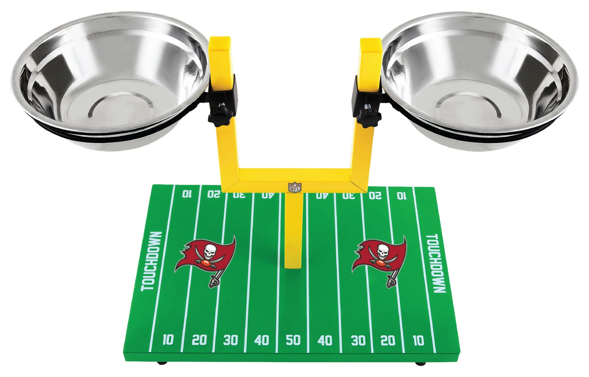 Made of durable materials this feeder comes with height adjustable dual stainless steel bowls set on a non-slip and waterproof football field designed base
