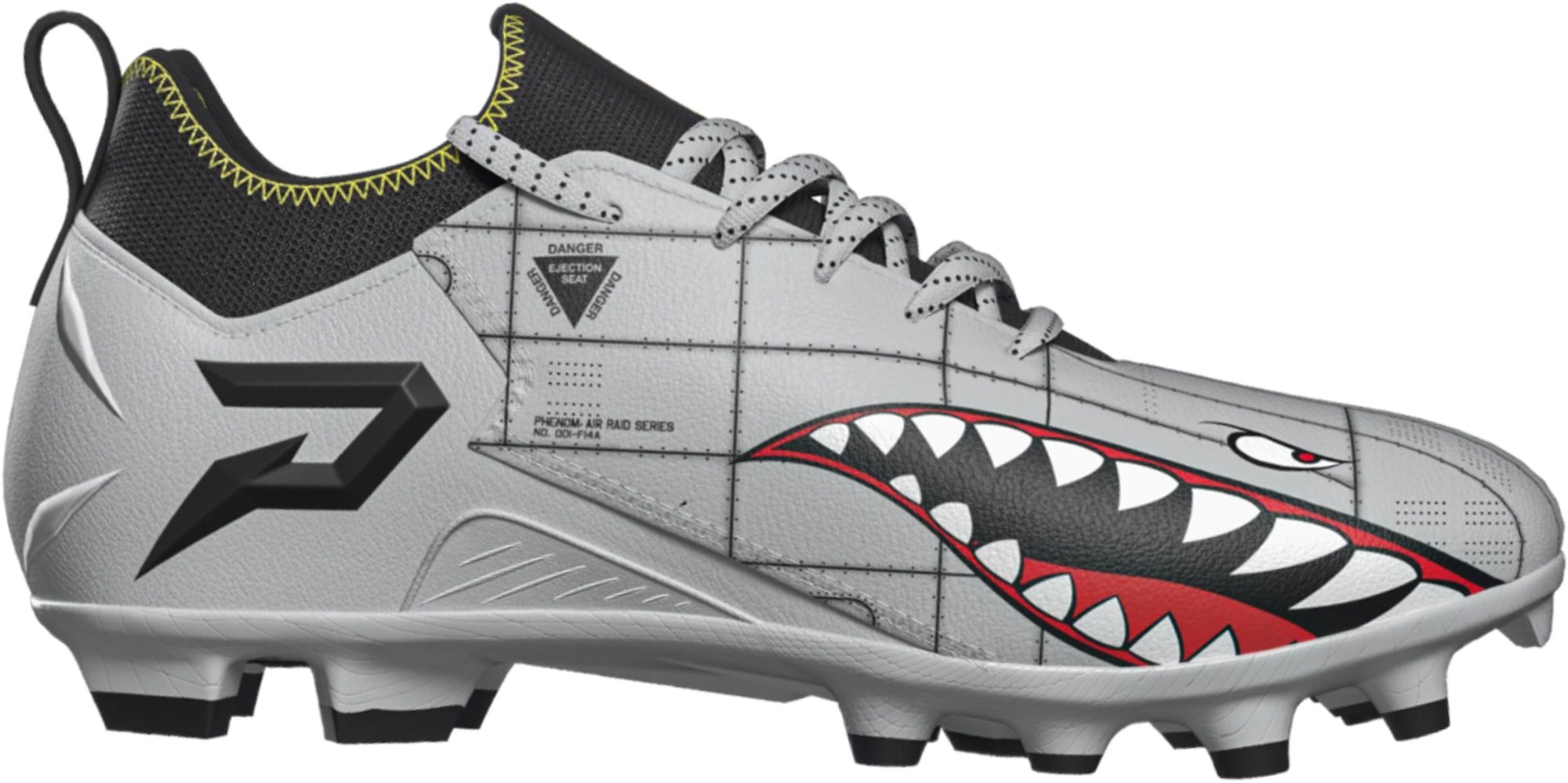 Taking design cues from the legendary F-14A fighter jet and the P-40 Warhawk, the Warhawk Football Cleats by Phenom Elite are engineered for pure speed. The sleek grey upper features aircraft panel stitching, aviation warnings, and the unmistakable shark-teeth artwork—paying tribute to one of the fastest jets ever built, now reimagined for the speed demons of the gridiron. As part of the Air Raid Series, this cleat honors the aggressive, fast-paced nature of football.