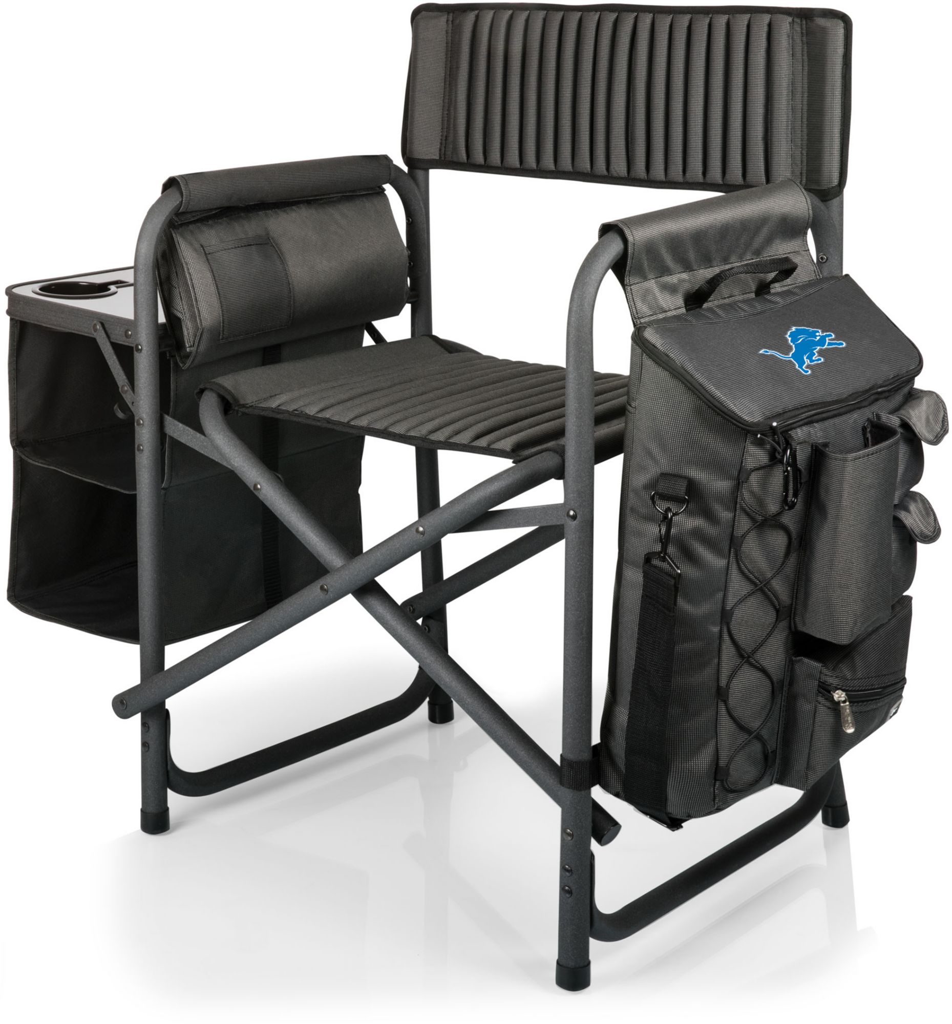 Fully-detachable, side-mounted 24+1-can insulated cooler with a multitude of storage pockets and adjustable shoulder strap so cooler can be used independent of the chair