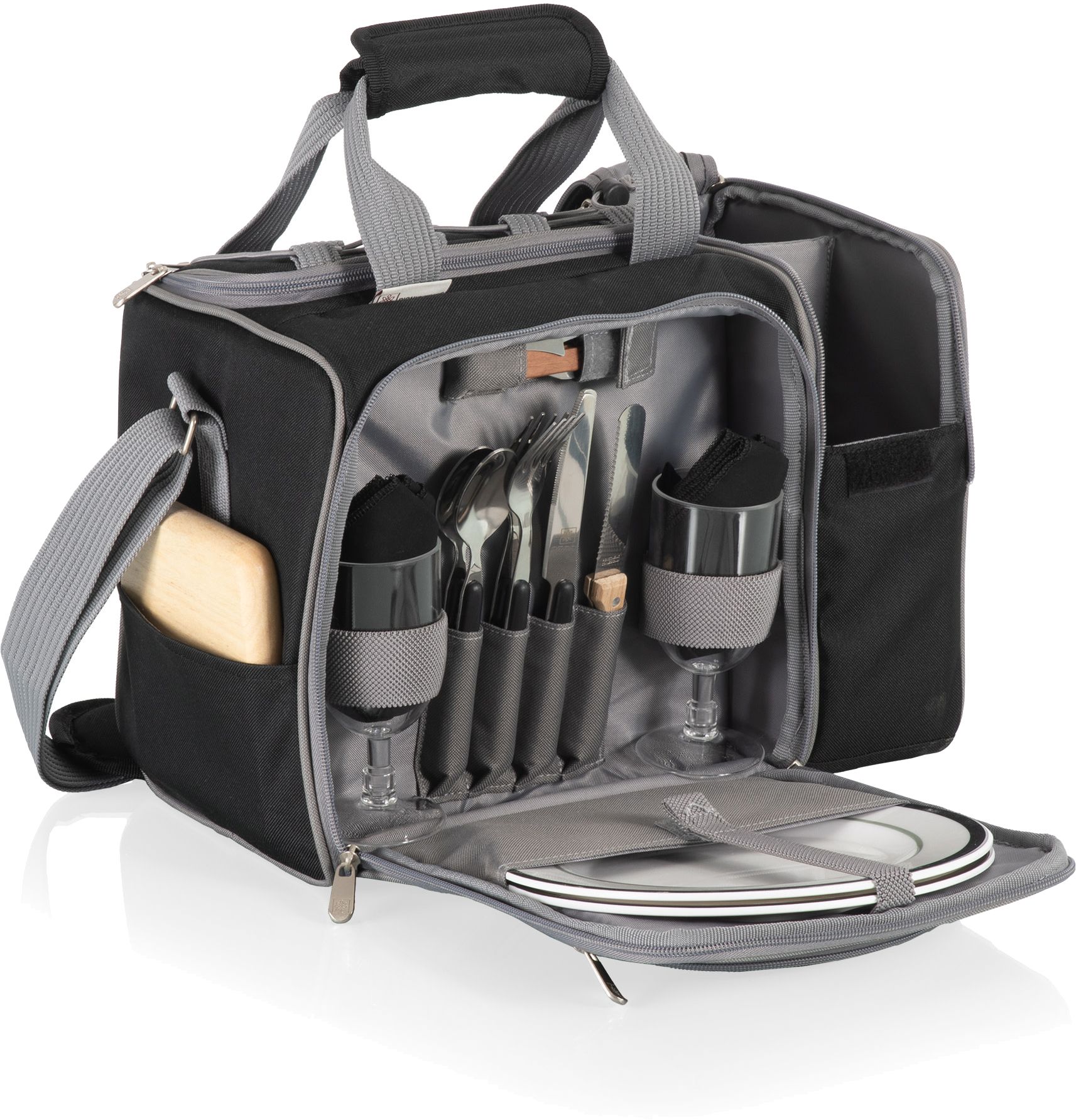 • 1 Picnic Tote (14.5'' x 10.5'' x 9''); 2 Plates (Melamine, 9''); 2 Wine Glasses (PS, 2.5'' D x 5.1'' H, 8 oz.); 2 Napkins (100% Cotton, 14'' X 14''); 2 18/0 Stainless Steel Forks (7.75''); 2 (18/0) Stainless Steel Knives (8.25''); 2 (18/0) Stainless Steel Spoons (5.5''); 1 Hardwood Cutting Board (Ash, 6'' X 6''); 1 Stainless Steel Cheese Knife with Wooden Handle, (7.5'' X 7.5''); 1 Stainless Steel Waiter-Style Corkscrew