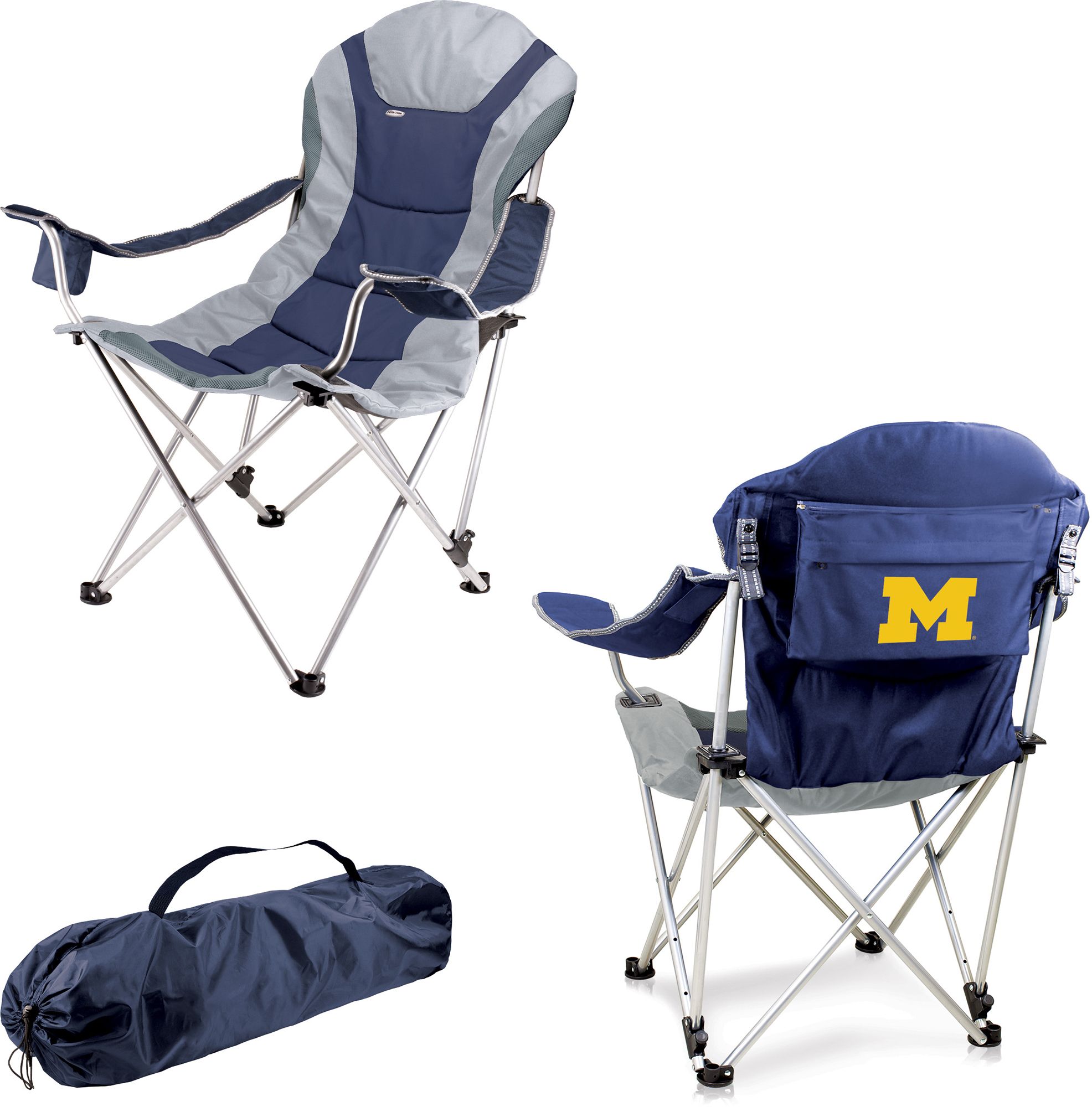 I bought the Michigan Wolverines camp chair for Christmas. I was very disappointed in what was opened on Christmas morning. Nothing wrong but for the price you would think that the Michigan logo would be more than just on a detachable bag and the reclining “feature” would allow active reclining. To recline you have to physically adjust the bars of the chair and it’s in a “reclining” position you can’t do it while sitting in the chair.