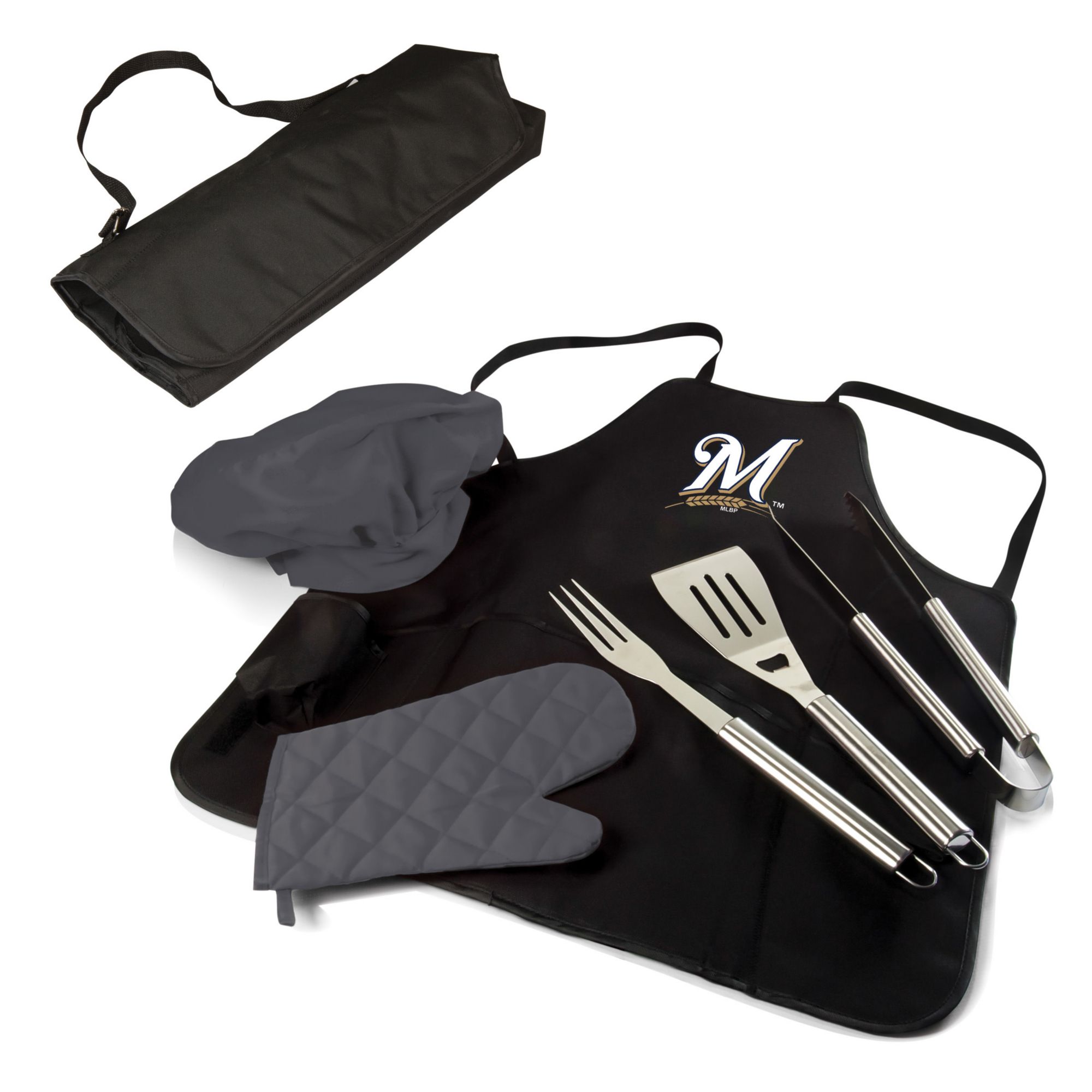 Converts to full-sized apron with deluxe barbecue set inside