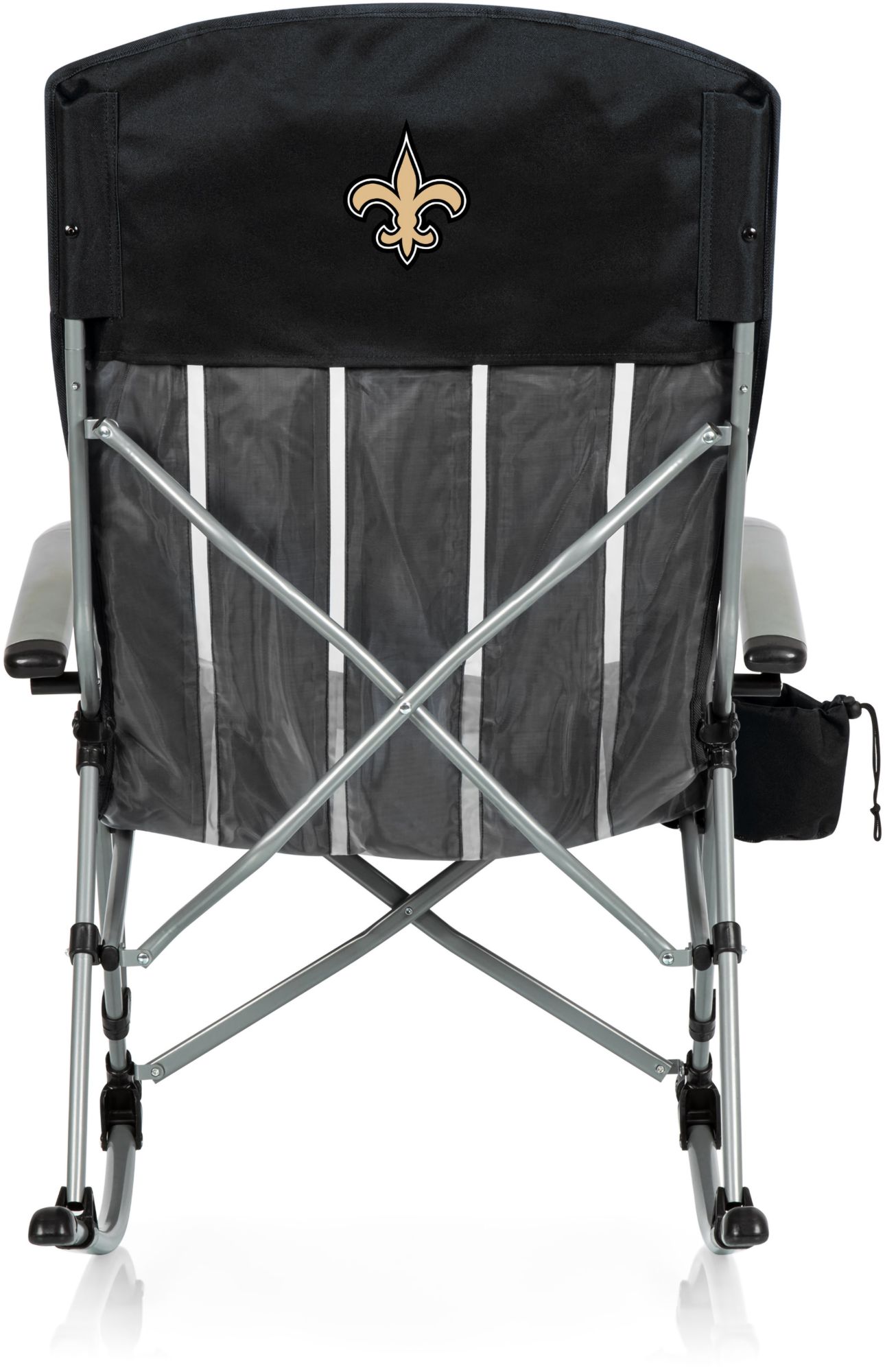 Folding rocking chair with mesh cup holder in armrest