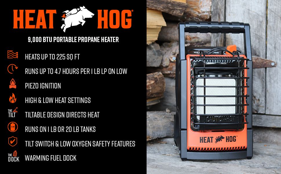 Go hog wild with the 9,000 BTU portable propane heater from Heat Hog. This durable indoor safe portable radiant space heater runs quietly on 1lb cylinder or a 20lb propane tank (with accessory hose) and doesn't require any electricity. Giving you up to 4.7 hours of heat per 1 lb. LP tank max on the lowest setting.