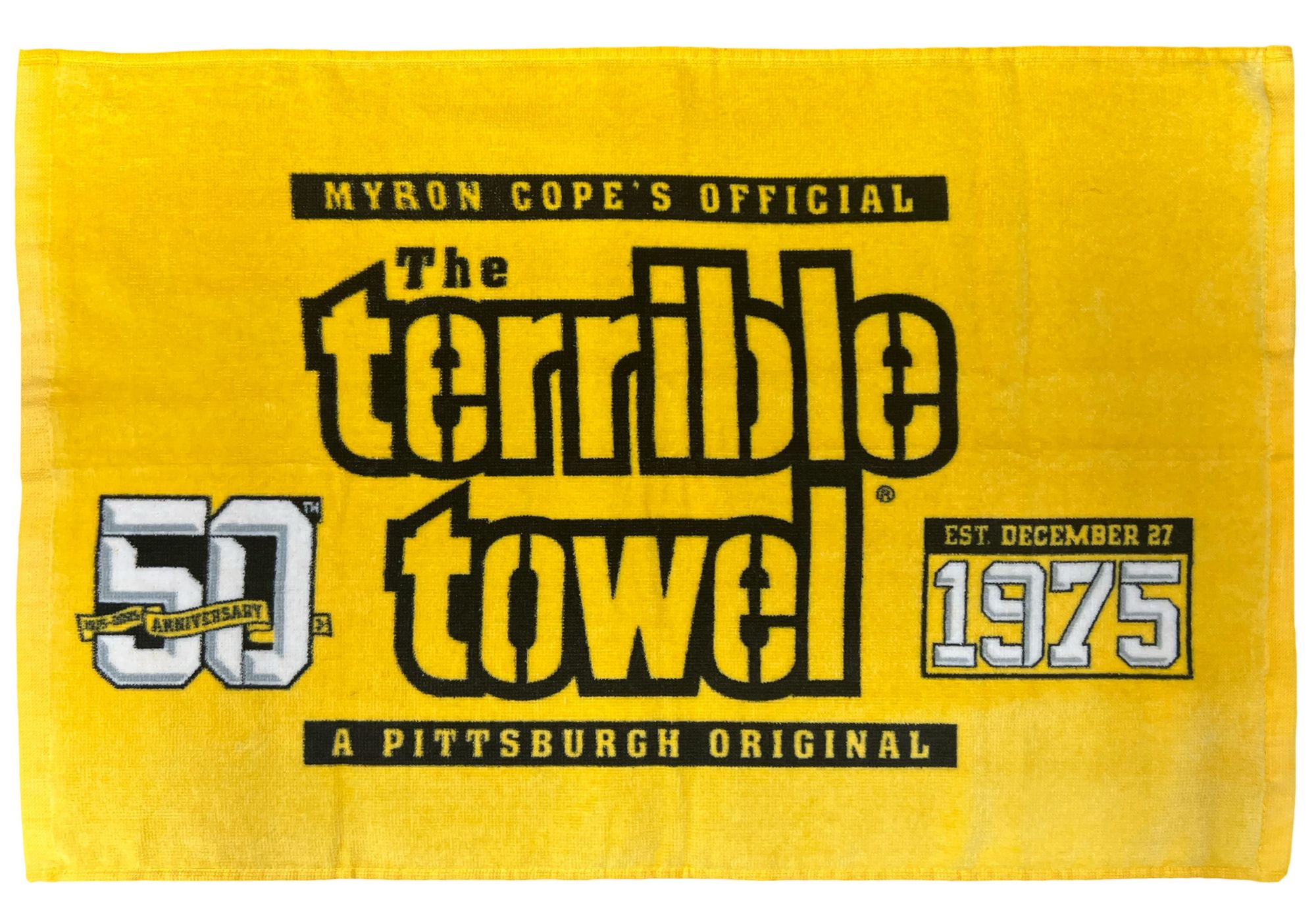 Celebrate the start of a legacy with the Pittsburgh Steelers 50th Anniversary Printed Terrible Towel&re;. Initially born as a promotional item for fans to wave at the playoff game against the Baltimore Colts on December 27, 1975, Myron Cope created a tradition that has spanned generations. Now a staple in Steelers fans' homes across the globe, the Terrible Towel® has become an icon that many try to replicate, but fail to achieve the same impact. This towel features a classic design with the 50th anniversary logo on the left side, paired with the inception date on the right to commemorate the event. Honor 50 years of the iconic symbol of Steel City football with the Pittsburgh Steelers 50th Anniversary Printed Terrible Towel®.