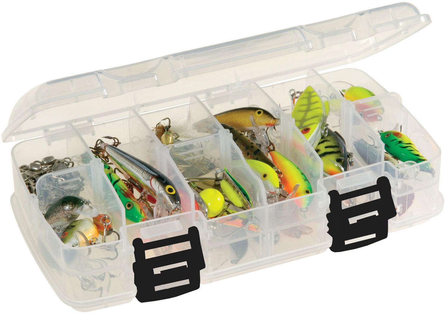 Store your smaller tackle accessories, baits or hooks in the Plano® 3450-22 Double- Sided Utility Box. This double-sided utility box has 12-18 adjustable compartments and a clear construction for easy viewing. Easy to transport and store in your tackle bag or box because of the size and secure latching system, this Plano® utility box is a great addition to your fishing gear.