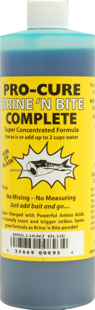 Brine ‘N Bite Complete Liquid Bait Brine is an amazingly easy and convenient way to enhance your bait. The Natural Shine formula is UV enhanced and features Bait Brite, turning you bait into a noticeable target for fish. In addition, the vibrant fluorescent color dyes your bait, adding even more visibility. Pro-Cure® Brine ‘N Bite Complete Liquid Bait Brine has a blend of amino acids to attract your catch and encourage it to strike.