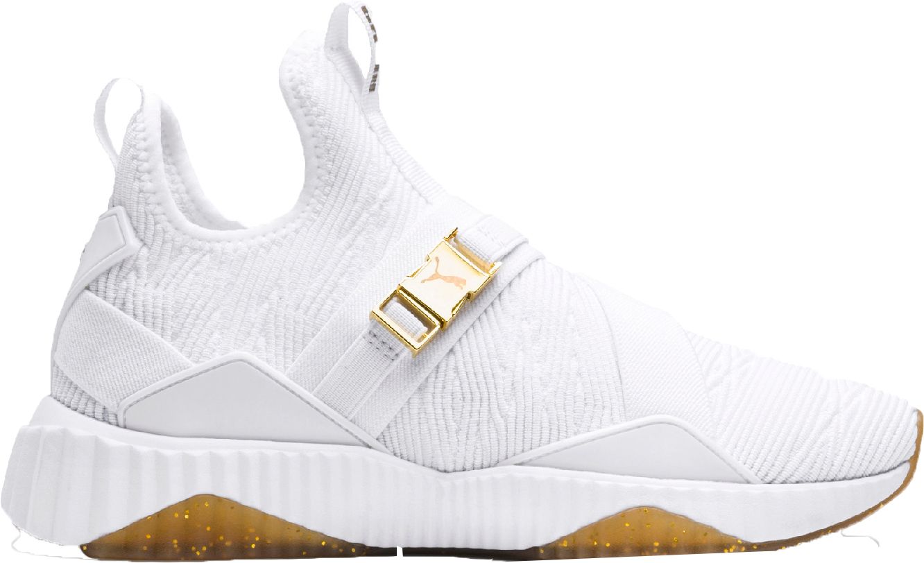 As ready for the gym as it is for the streets the PUMA® Women’s Defy Varsity Mid shoes deliver an elegant silhouette you’ll love. A feather-light, high-rebound midsole provides superior energy return, cushioning and comfort, while it’s slip-on bootie construction gives a sock-like feel. The form-fitting textile upper, sleek monochromatic lines and sparkly outsole and gold hardware complete this shoe with a look so stylish you won’t want to leave home in anything else.