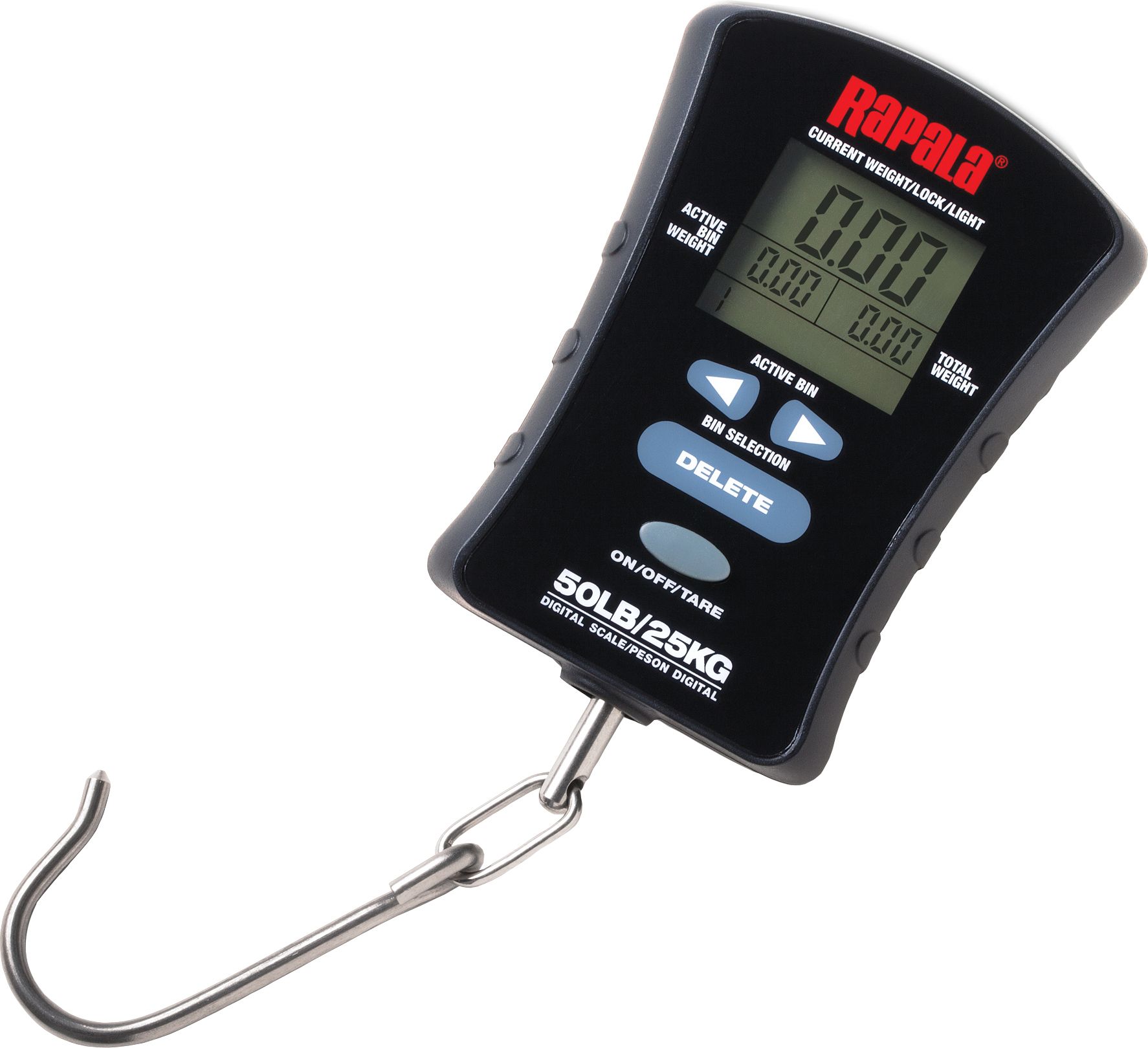 With the Rapala® Compact Touchscreen Fishing Scale, you'll have the ability to store the individual weights of up to 8 bins. Able to measure a max of 50 pounds, this fishing scale constantly displays bin weight. Fishers can view weights as pounds, ounces, decimal pounds or kilogram increments. The Rapala fishing scale’s bright screen, backlight, and easy, portable size add further convenience.