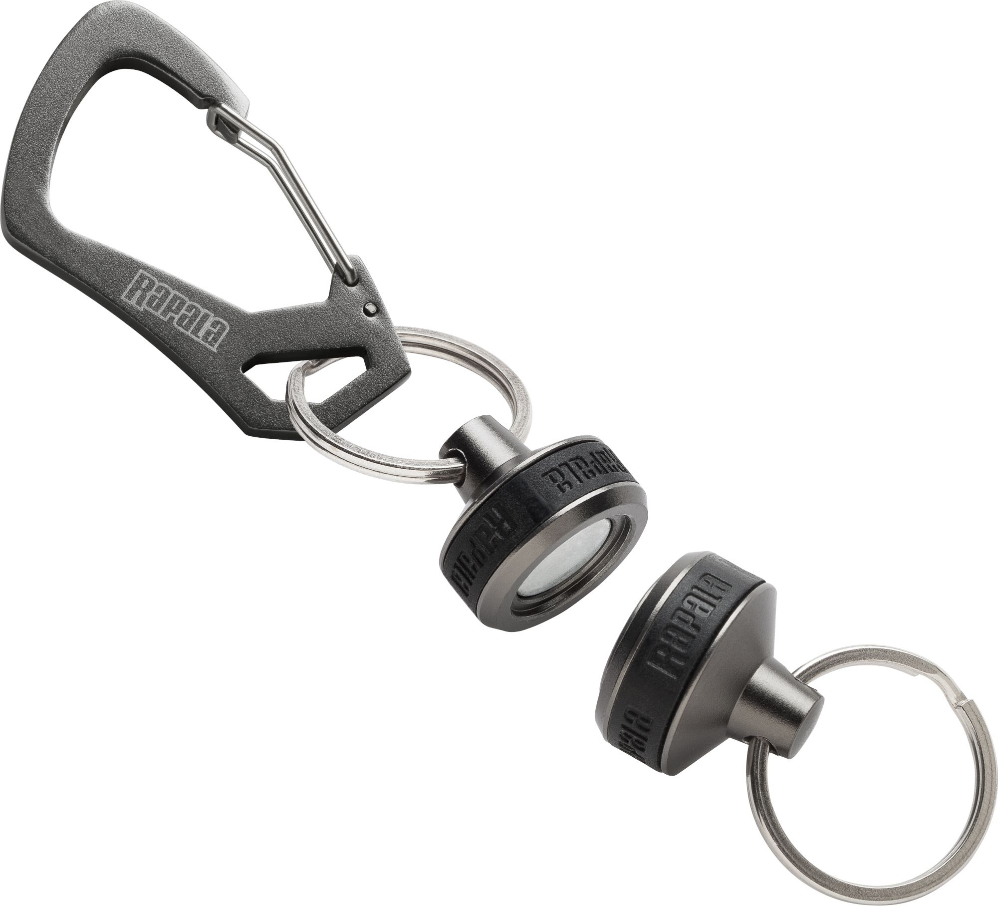 The Magnetic Release Clip is an excellent way to keep your tools secure on your person, while ensuring that they are still accessible when you need them. One end features a carabiner that conveniently clips onto your belt loop and the other end is equipped with a heavy duty split ring for tool attachment. Tough connecting magnets hold the ends of the Rapala® Magnetic Release Clip together for quick detachment.