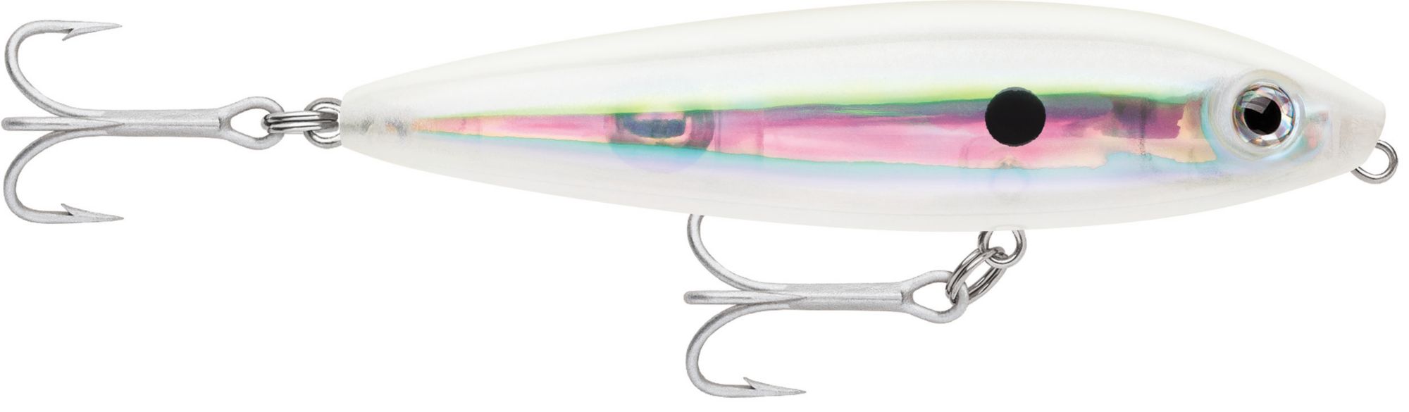 The Saltwater Skitter Walk® Topwater is designed with “Walk-the-Dog” action that mimics the swimming of a mullet or fleeing baitfish, attracting the attention of game fish. In addition, the realistic eyes and bright finish make it an irresistible target. The rugged construction and premium VMC® Perma Steel® hooks ensure that the Rapala® Saltwater Skitter Walk Topwater stands up to strikes of aggressive predators.