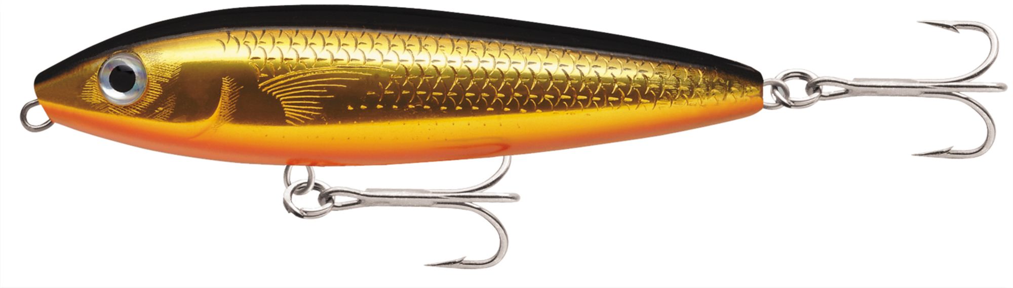The Saltwater Skitter Walk® Topwater is designed with “Walk-the-Dog” action that mimics the swimming of a mullet or fleeing baitfish, attracting the attention of game fish. In addition, the realistic eyes and bright finish make it an irresistible target. The rugged construction and premium VMC® Perma Steel® hooks ensure that the Rapala® Saltwater Skitter Walk Topwater stands up to strikes of aggressive predators.