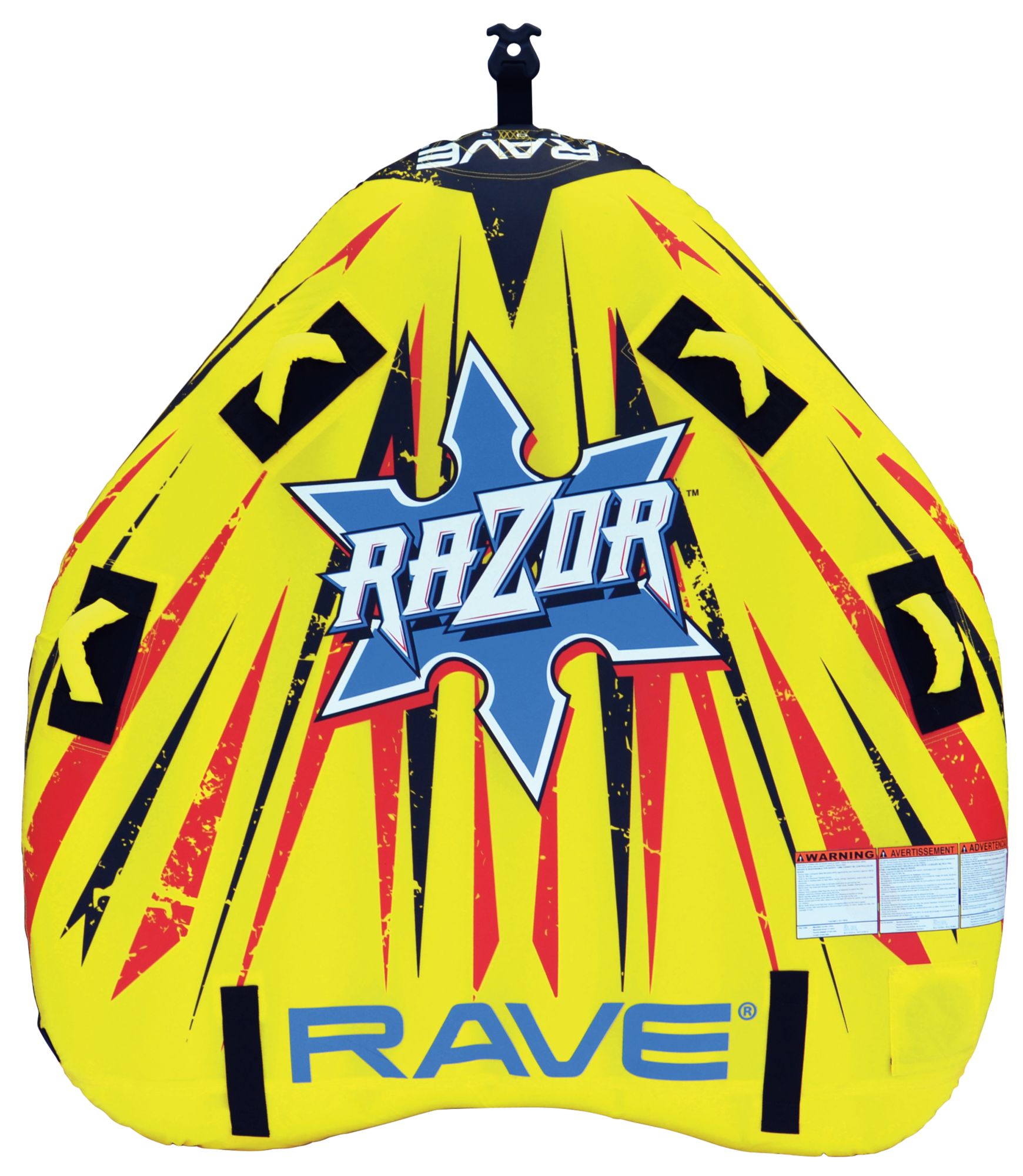 Ride big wakes with a friend on the Rave® Razor 2 Person Towable Tube. Featuring a low profile and rear boarding strap, this towable water tube is easy to board and steer. A Skim-Fast™ bottom offers speed when gliding over waves. Hold on to 4 foam-filled handles with knuckle guards. This cockpit style tube is built to last with a heavy duty PVC bladder, Stay-Brite technology, and durable polyester cover. Cut through waves on the Razor.