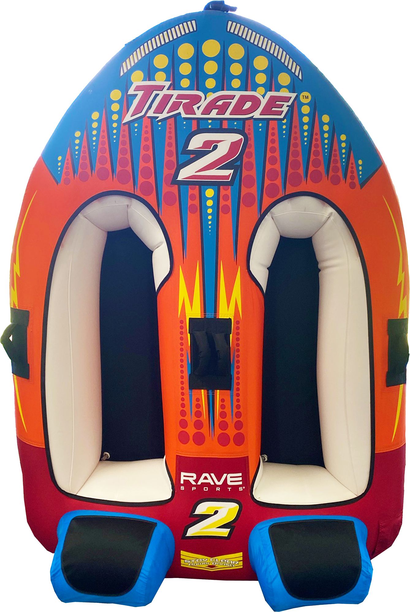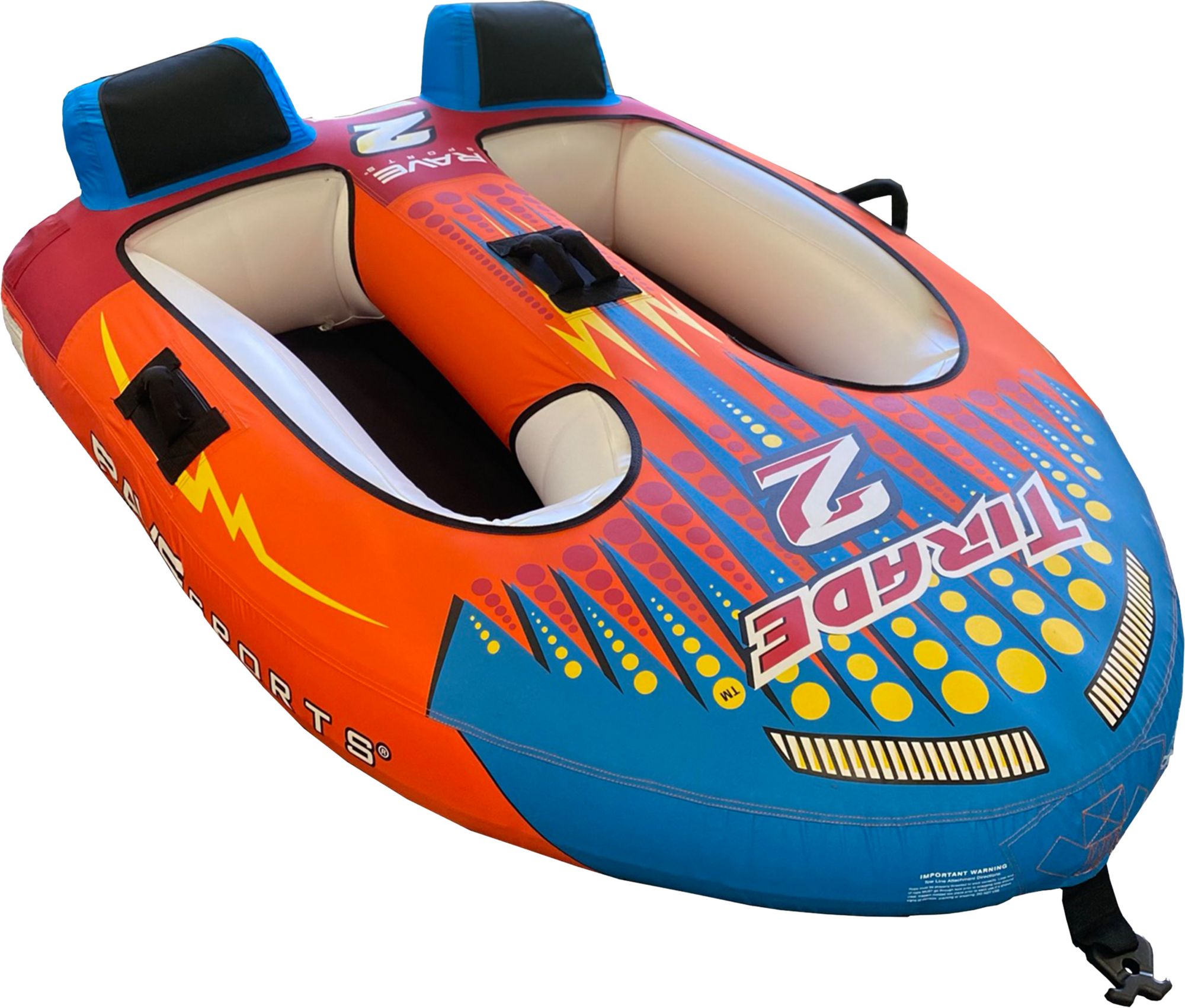 Zoom through the water on the Rave Sports® Tirade II Towable Tube. This sports car inspired tube is designed with two deep 42" long, oversized cockpits for extra stability. The Tirade II offers a comfortable ride thanks to neoprene covered headrests and inflatable floors. The Rave Tail™ shoots water high into the air behind the tube.