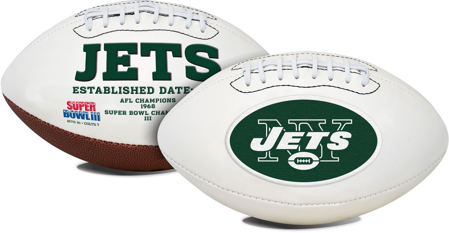 Add to your collection of memorabilia with the Rawlings® New York Jets Signature Series Full-Sized Football. This football features three smooth white panels designed for your favorite Jets’ autographs, an embroidered team logo and wordmark, as well as the team championship history, so you can display this collectible with pride. Everyone will know you’re a die-hard fan when you get the Rawlings® Signature Series Football.