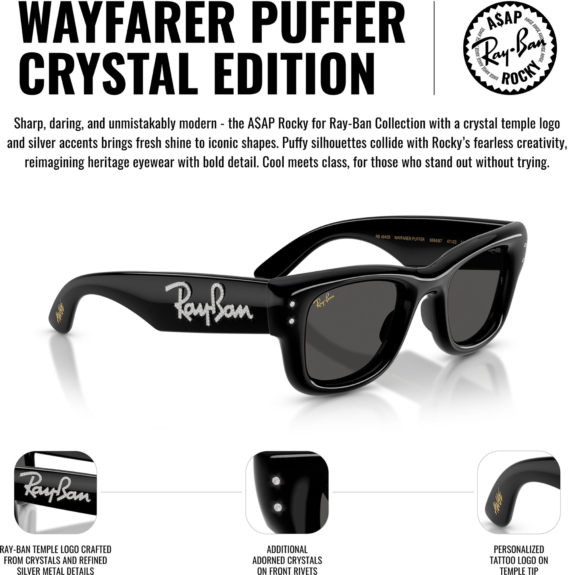 A$AP Rocky’s iconic Wayfarer Puffer in black — where hip-hop heritage meets bold, elevated style. The inflated, puffy frames reimagine the classic silhouette, merging timeless Ray-Ban cool with Rocky’s fearless creativity. Accented with a Ray-Ban temple logo crafted from crystals and refined silver metal details, this sleek black edition makes an unforgettable statement.