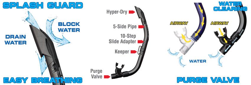 Breathe easily as you scan the ocean blue with the Reef Tourer® Semi-Dry Snorkel! This semi-dry snorkel is perfect for all of your snorkeling adventures with its lightweight and travel friendly design. Hyperdry Technology reduces the water flow into your snorkel, while a drain chamber and purge valve clear accidental leakage quickly for your breathing comfort!