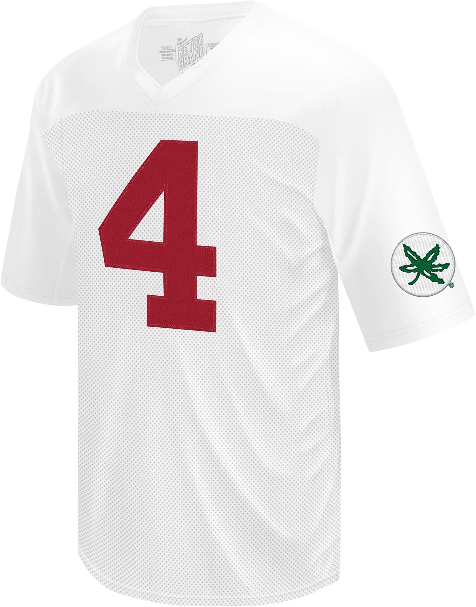This retro style pops. Red number on a white jersey. Clean style. Buckeyes on sleeves. Maybe leans to a fuller cut than otherwise.