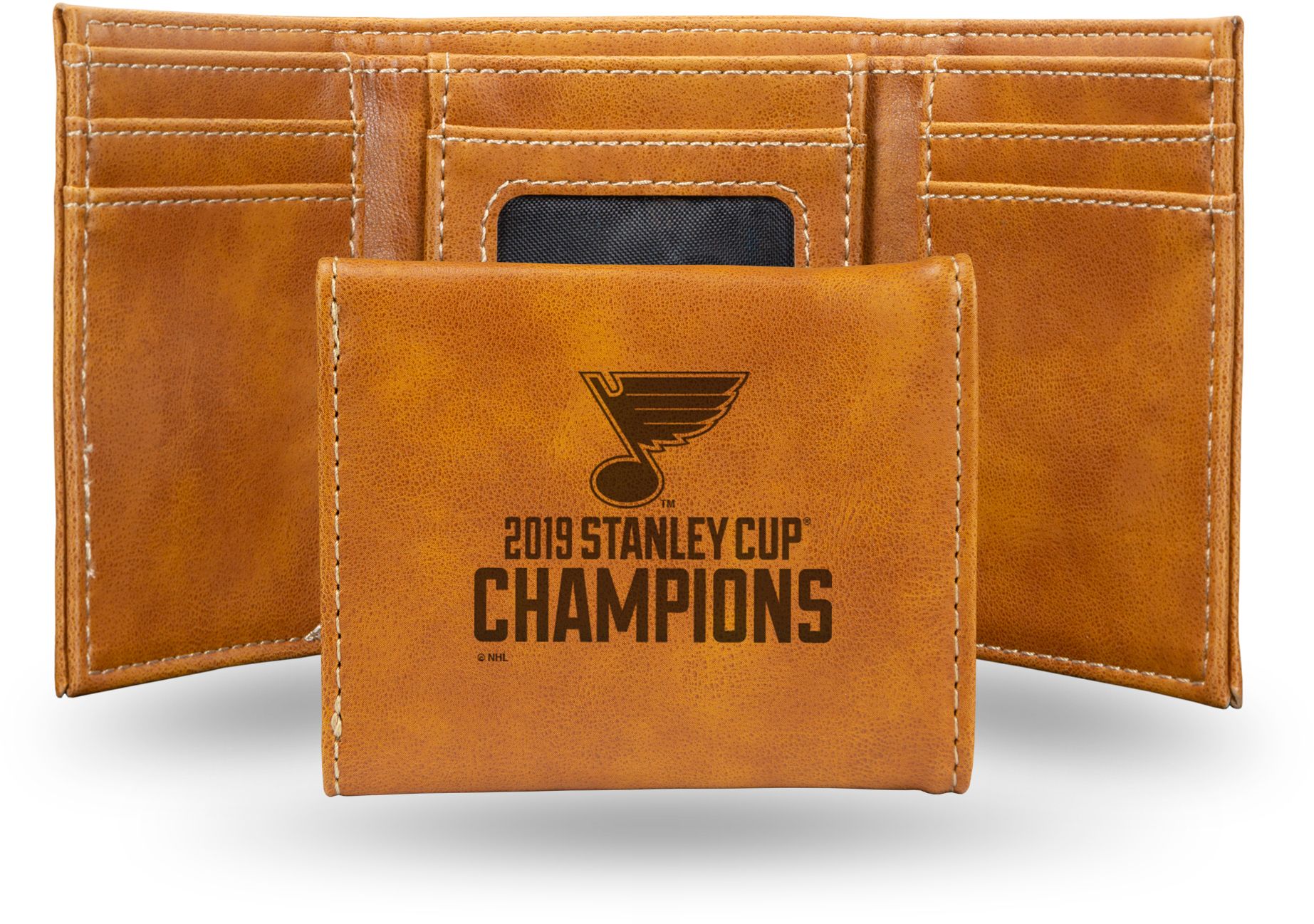 Keep your cards and cash secure without sacrificing your team championship pride with the Rico® 2019 NHL® Stanley Cup® Champions St. Louis Blues Laser Engraved Trifold Wallet.