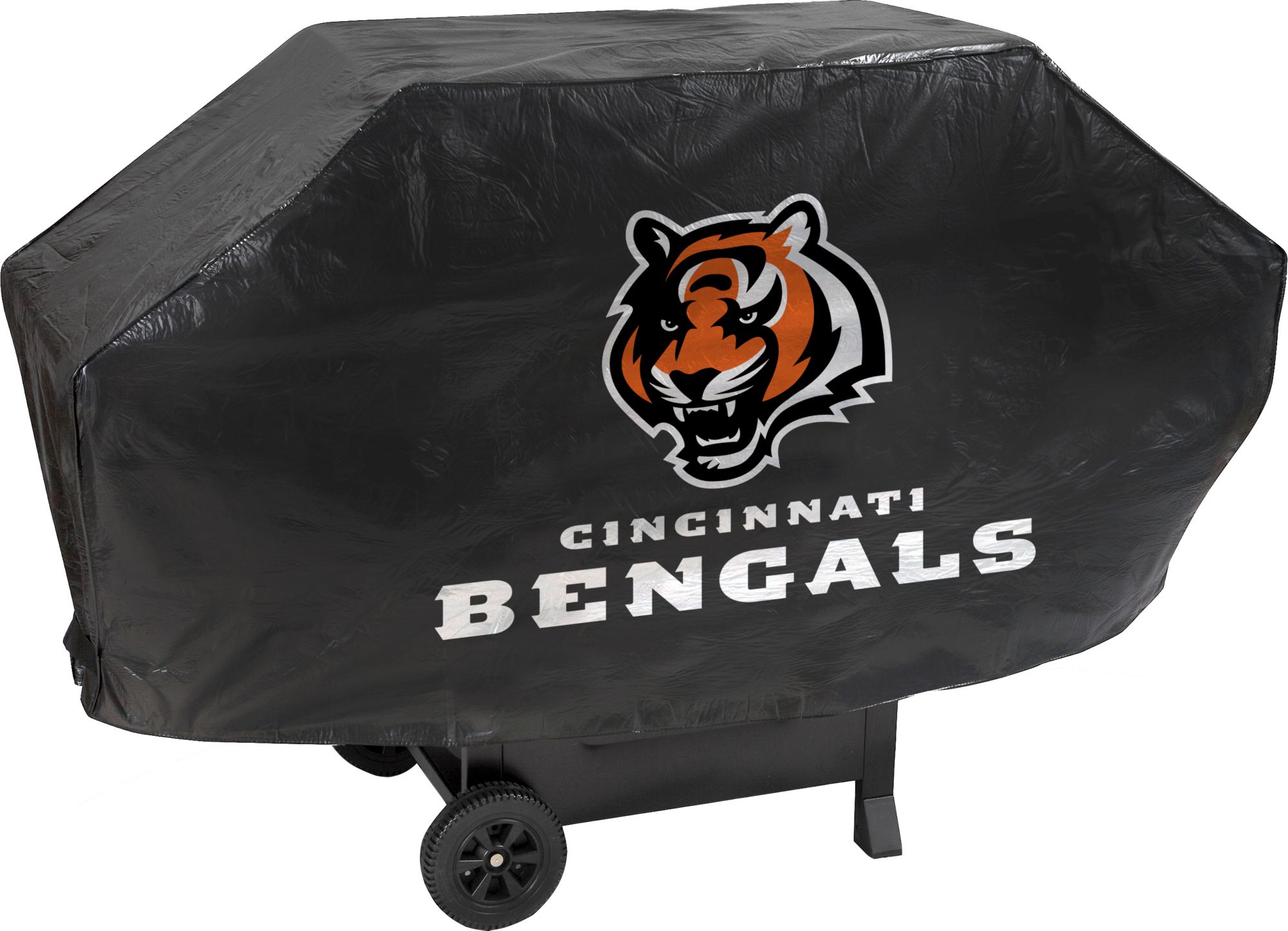 Protect your grill while showing your team pride with the Rico® NFL Cincinnati Bengals Deluxe Grill Cover. Constructed of durable vinyl and lined with white felt to prevent scratching, this cover displays a large team logo on one side. The heavy duty stitching can withstand up to 30 pounds of pull strength and hook-and-loop hook-and-loop closures keep it securely in place through windy conditions.