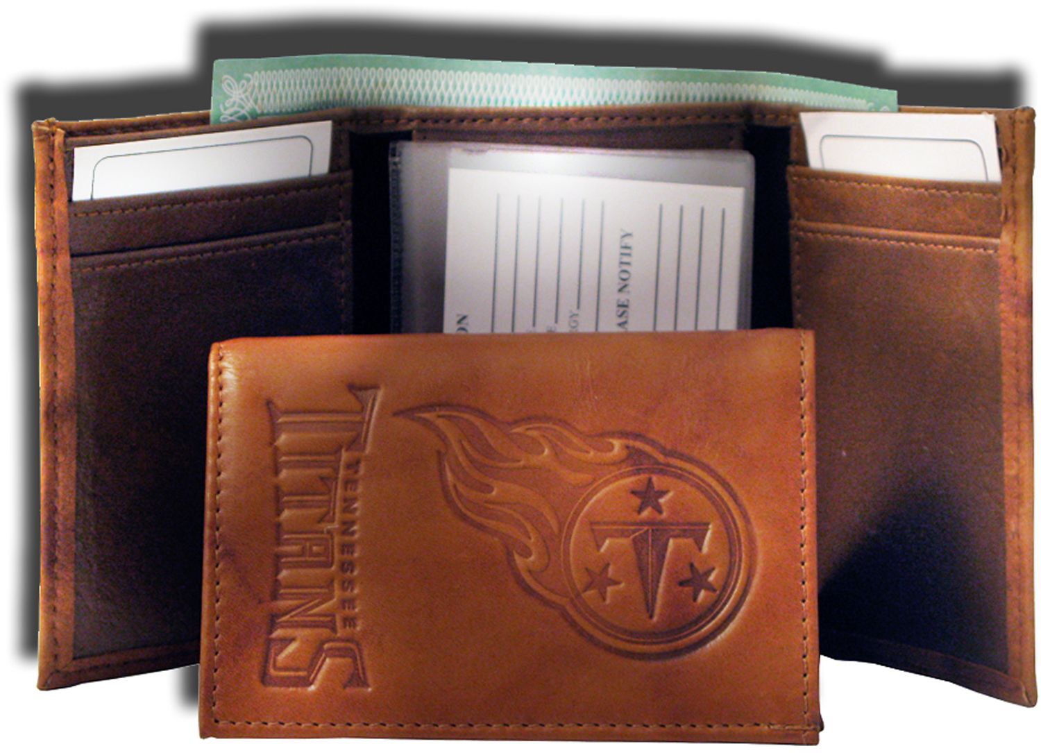 Carry your essentials and show your team pride with the Rico® NFL Tennessee Titans Embossed Tri-Fold Wallet. Featuring a clear plastic identification slot, room to hold approximately four credit cards and a plastic picture insert, this wallet is exceptionally functional. The embossed team graphics display your Titans pride, so everyone will know you’re not a fair-weather fan when you carry the Rico® Embossed Tri-Fold Wallet.