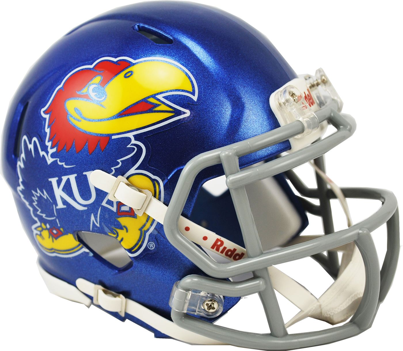 Add a one-of-a-kind keepsake to your collection of KU gear with the Riddell® Kansas Jayhawks Mini Football Helmet. Designed with team graphics and colors, this half-sized helmet showcases your team spirit and serves as a great souvenir for getting player autographs. The interior padding, 4-point chinstrap, and facemask replicate the same helmet you see on the field, giving you the most authentic keepsake around.