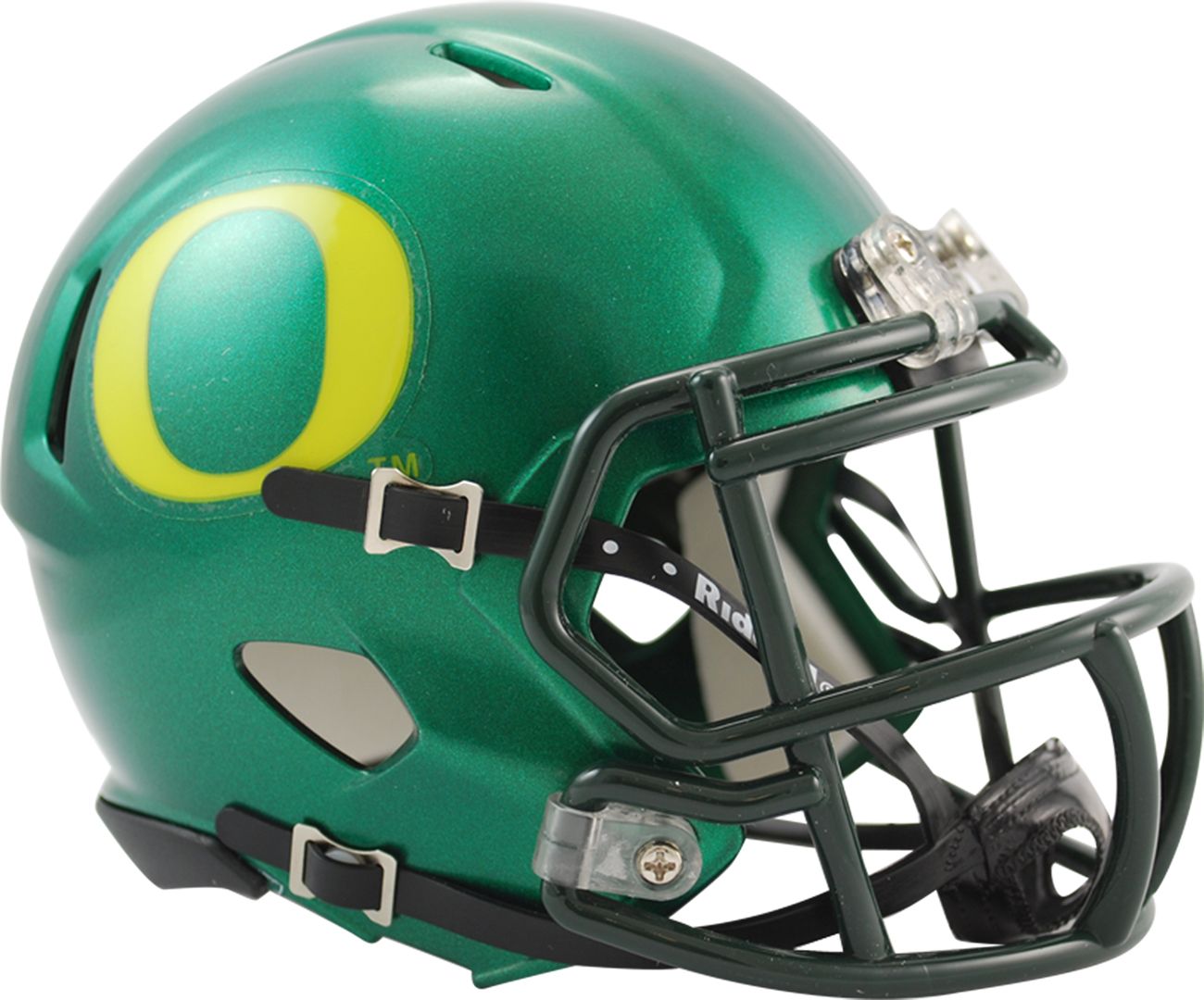 Take your Ducks passion to the next level with the Riddell® Oregon Ducks Mini Football Helmet. This keepsake features team graphics and colors on a half-scale replica helmet that showcases your loyalty for Oregon. The 4-point chinstrap and interior padding replicate the same helmet you see players wear on the field. With its 5” design, this helmet is perfect for getting player autographs and showing off your fandom.