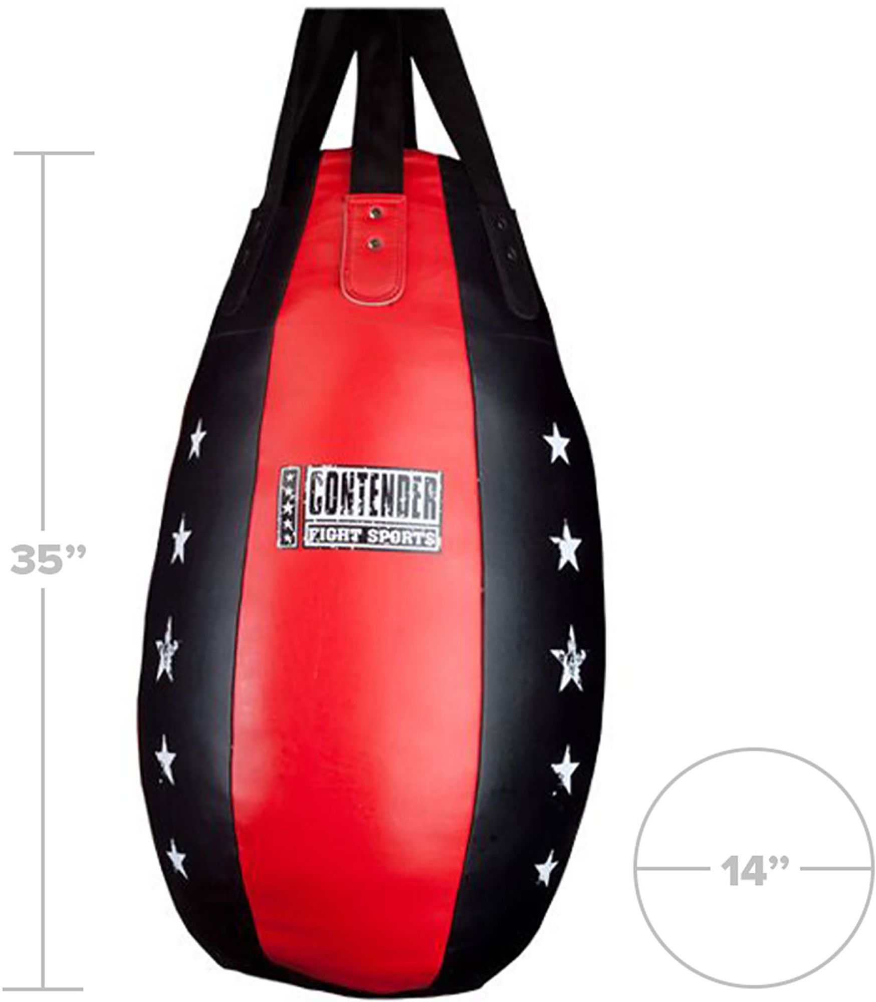 Contender Fight Sports specialty bag utilizes a teardrop shape with lower center of gravity to train kickboxing and Muay Thai style strikes.