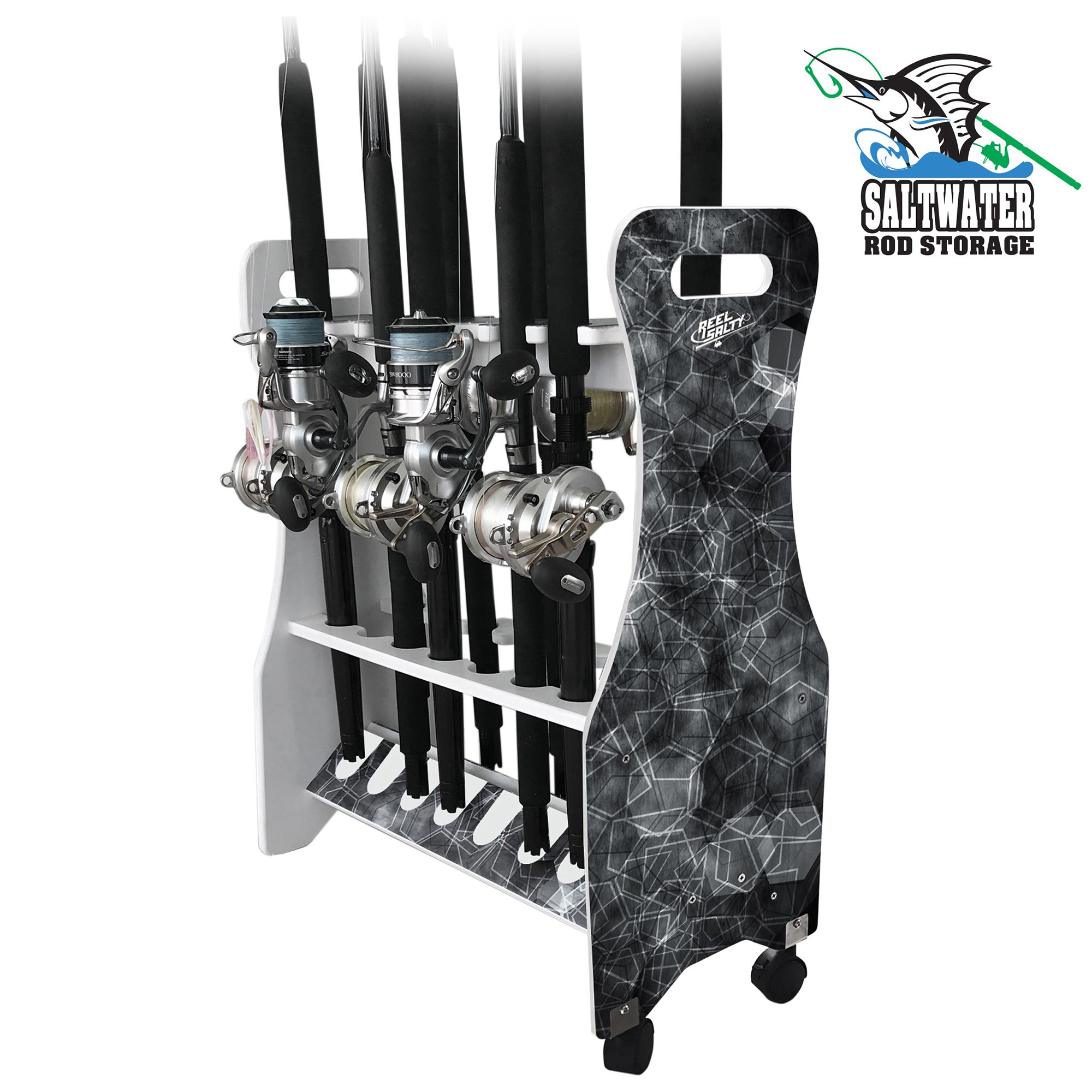 Rush Creek Reel Salty Saltwater 16 Rod Rolling Floor Rack