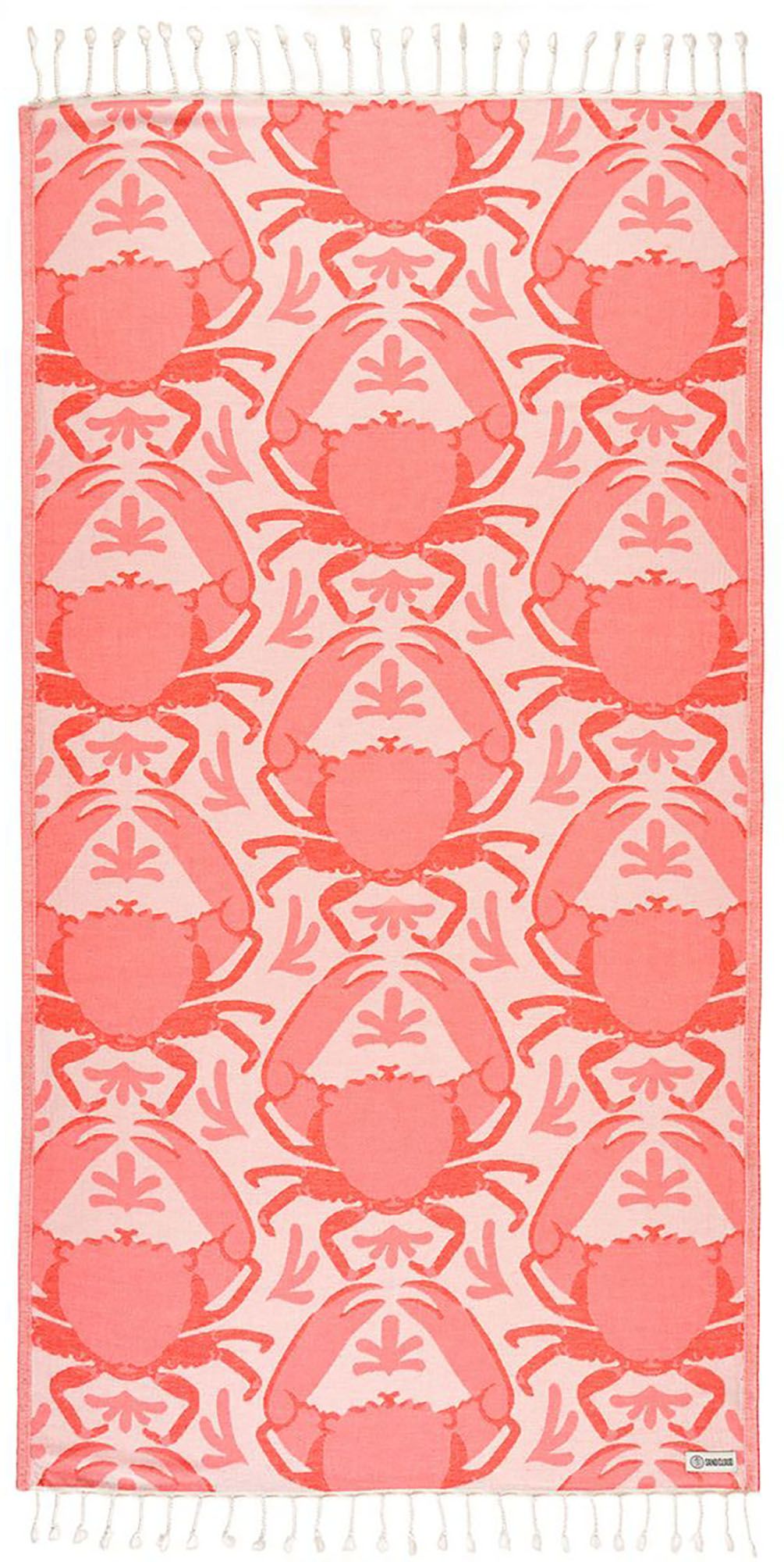 Crabby Day design; made from Turkish organic cotton for a softer hand feel and a better sustainable product. Regular size, single jacquard weave, twisted tassels, quick dry and sand resistant.