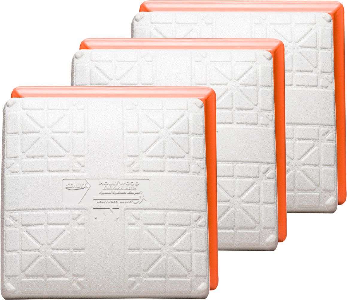 Designed for maximum player safety, the Schutt® Hollywood® Impact™ Kwik-Release® Varsity Base Set is Little League® approved and built for long-lasting performance. The tops of the Kwik-Release® Hollywood® Bases will compress and then disengage if impact is strong enough to reduce risk of leg injuries. Soft orange tabs on the platform hold the top of the base while still allowing players to slide over.