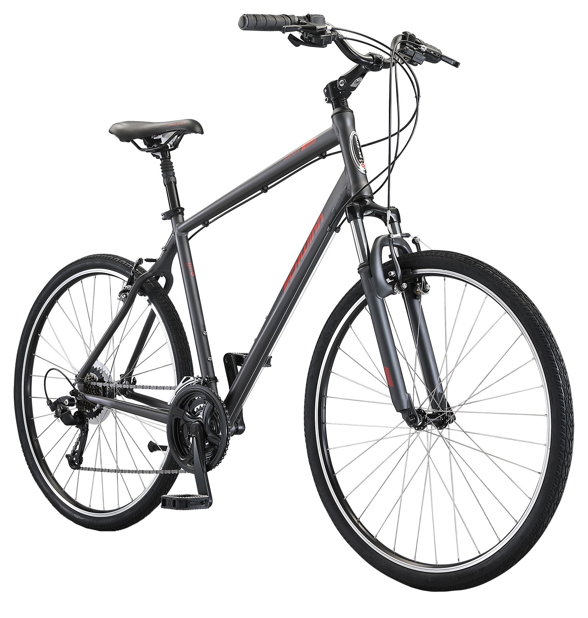 Set and accomplish all your biking fitness goals with the Schwinn Adult Fremont Hybrid Bike. The aluminum frame is lightweight and durable, and features front suspension to absorb impact from bumps. The Fremont is equipped with front suspension fork, 21 speeds, front and rear linear alloy pull brakes, adjustable stem, memory foam cushioned seat, and suspension seat post for maximum comfort on every ride.