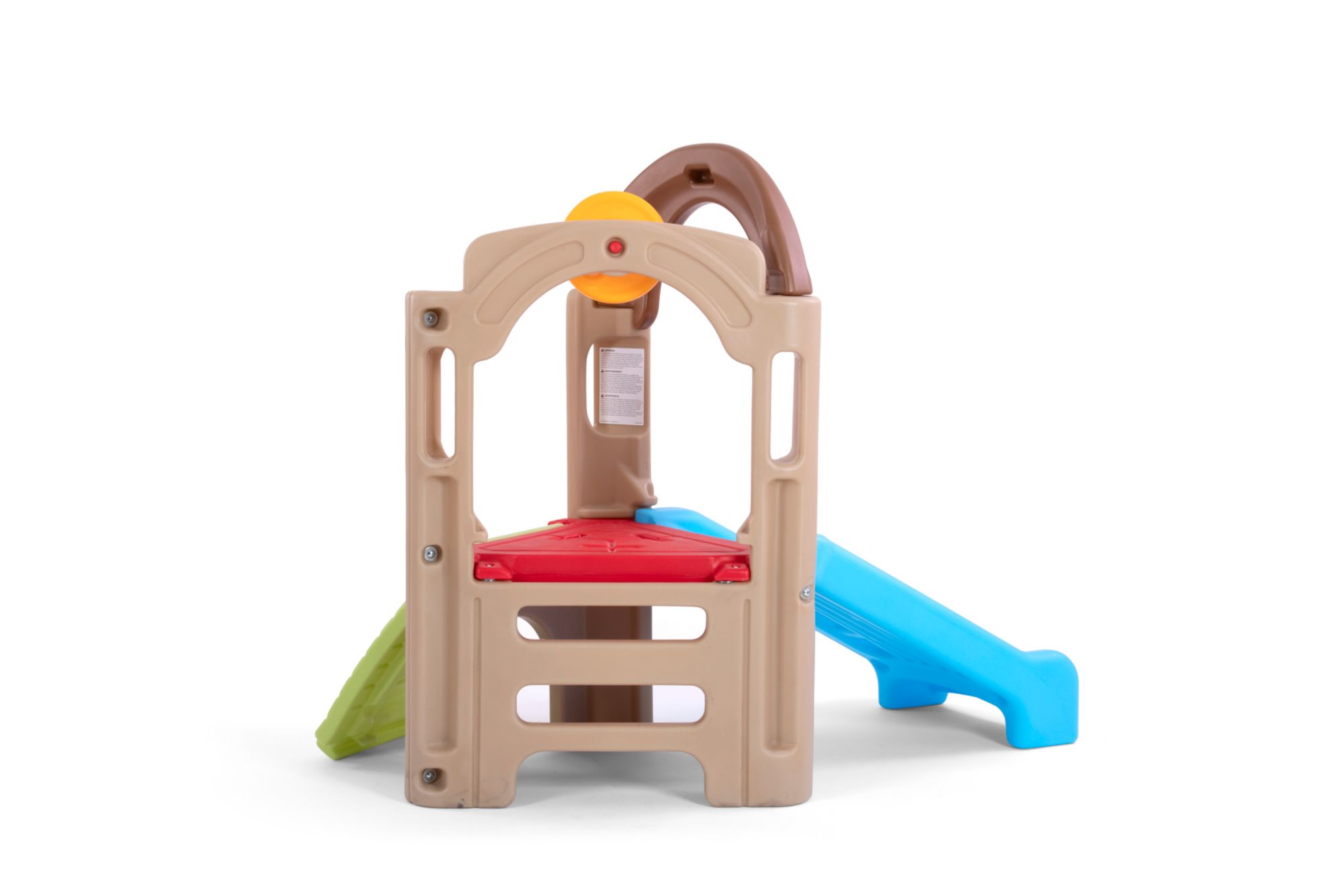 Two levels of play with crawl-through spaces, climbing wall with easy-grip hand and foot holds, steering wheel and extra wide slide helps kids develop gross motor skills
