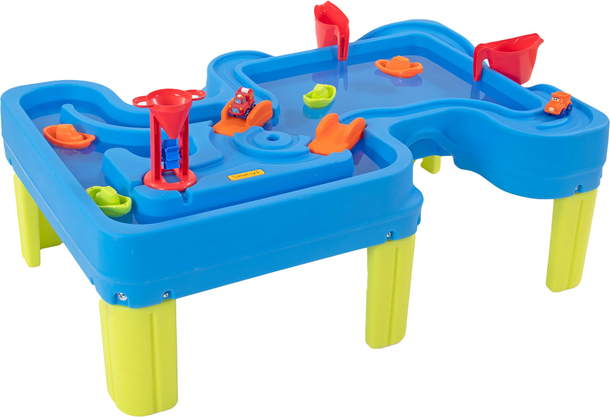 Features include universal road tracks for cars and trucks to drive up and down hills and all around the giant table, two working, moveable bridges to redirect traffic, winding waterways with an open water pool for imaginative water play, and nine accessories