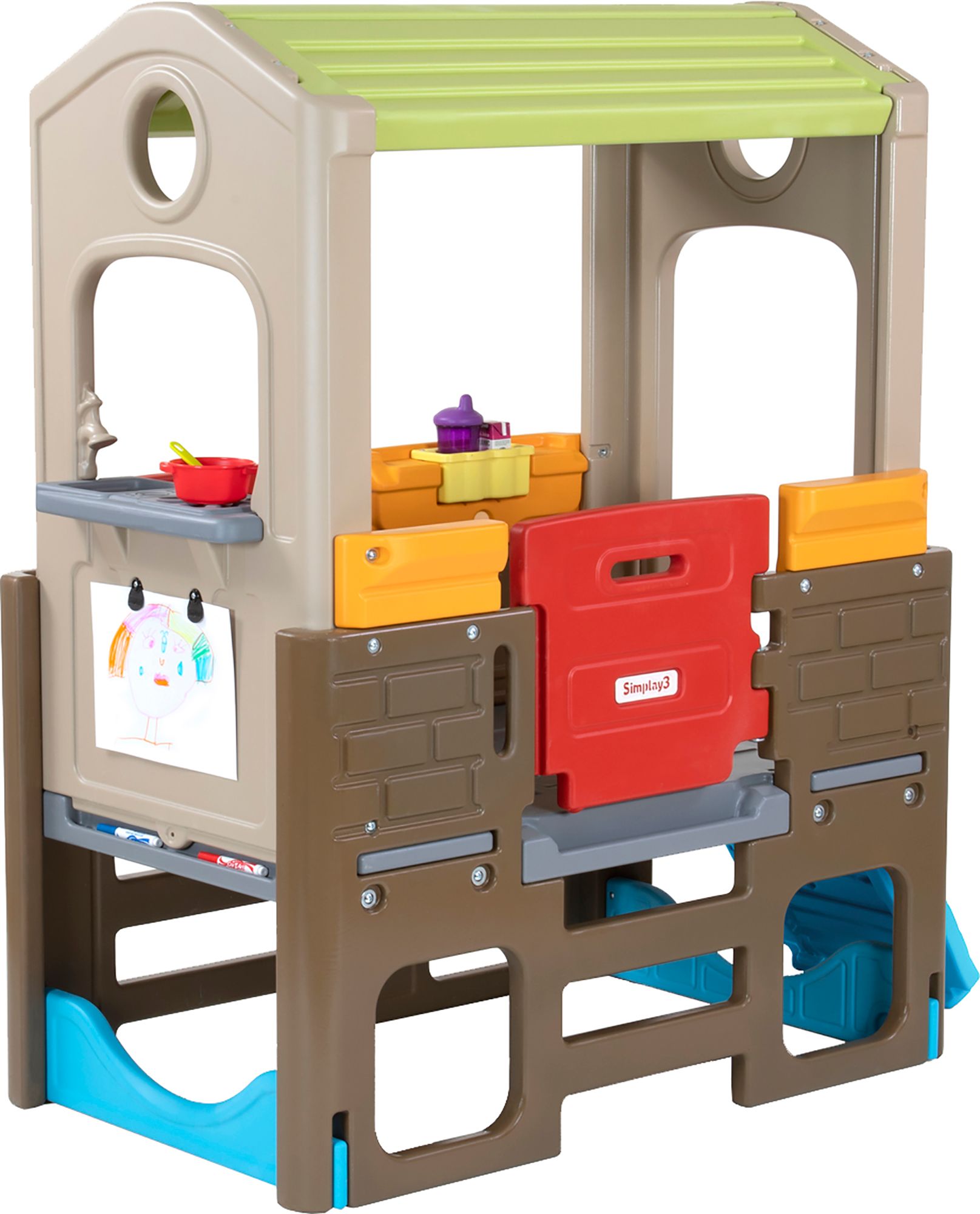 Features a pretend kitchen for cooking play, drink holder/planter, art board with paper clips and marker tray, two working doors with mail slots, and much more
