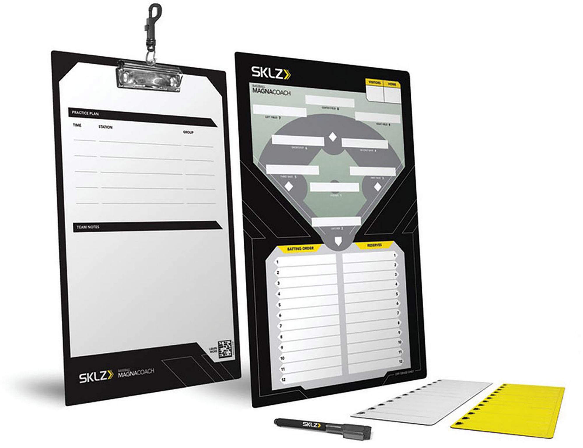 The SKLZ Magnacoach Baseball Board is a great way for coaches to communicate with players about the batting order and all fielding positions. Made from a durable, lightweight material, this baseball lineup board is weather-resistant for long-lasting use and includes a marker and eraser to easily make last-minute changes. Plus, the backside of this baseball lineup board allows coaches to note plays and adjustments to make during the next practice. For clear communication between coach and players, use the SKLZ Magnacoach Baseball Board this season.