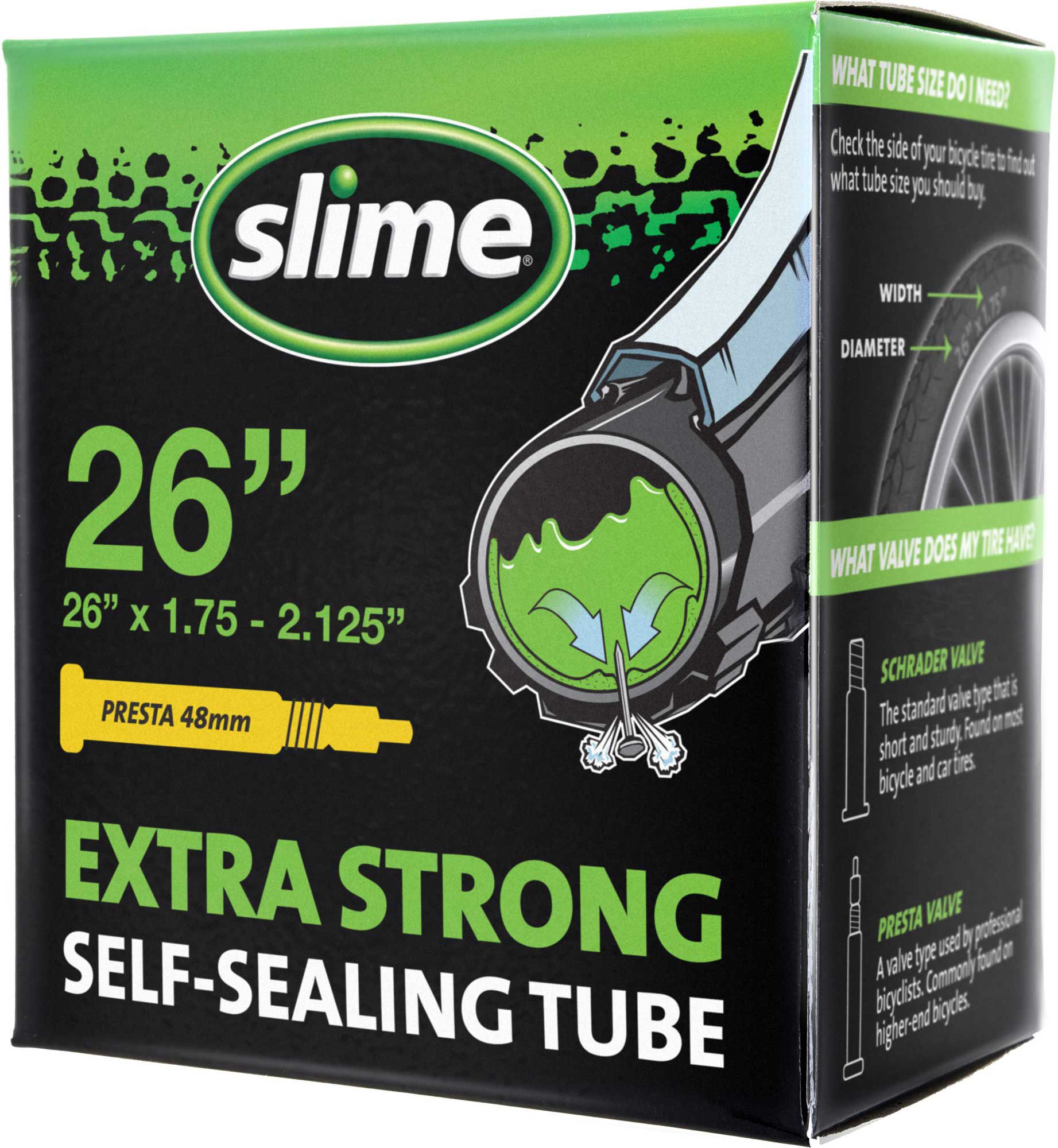 For protection from punctures on daring downhills and dirt jumps, outfit your bike with the Slime® Smart Tube Self-Healing Presta Valve 26” Bike Tube. Its innovative Slime® sealant prevents flats by instantly and repeatedly sealing punctures up to 1/8”. This unique tube is made with durable Butyl rubber while the sealant offers puncture protection for two years. Inflate the tube with its Presta Valve and hit the trails without worry.