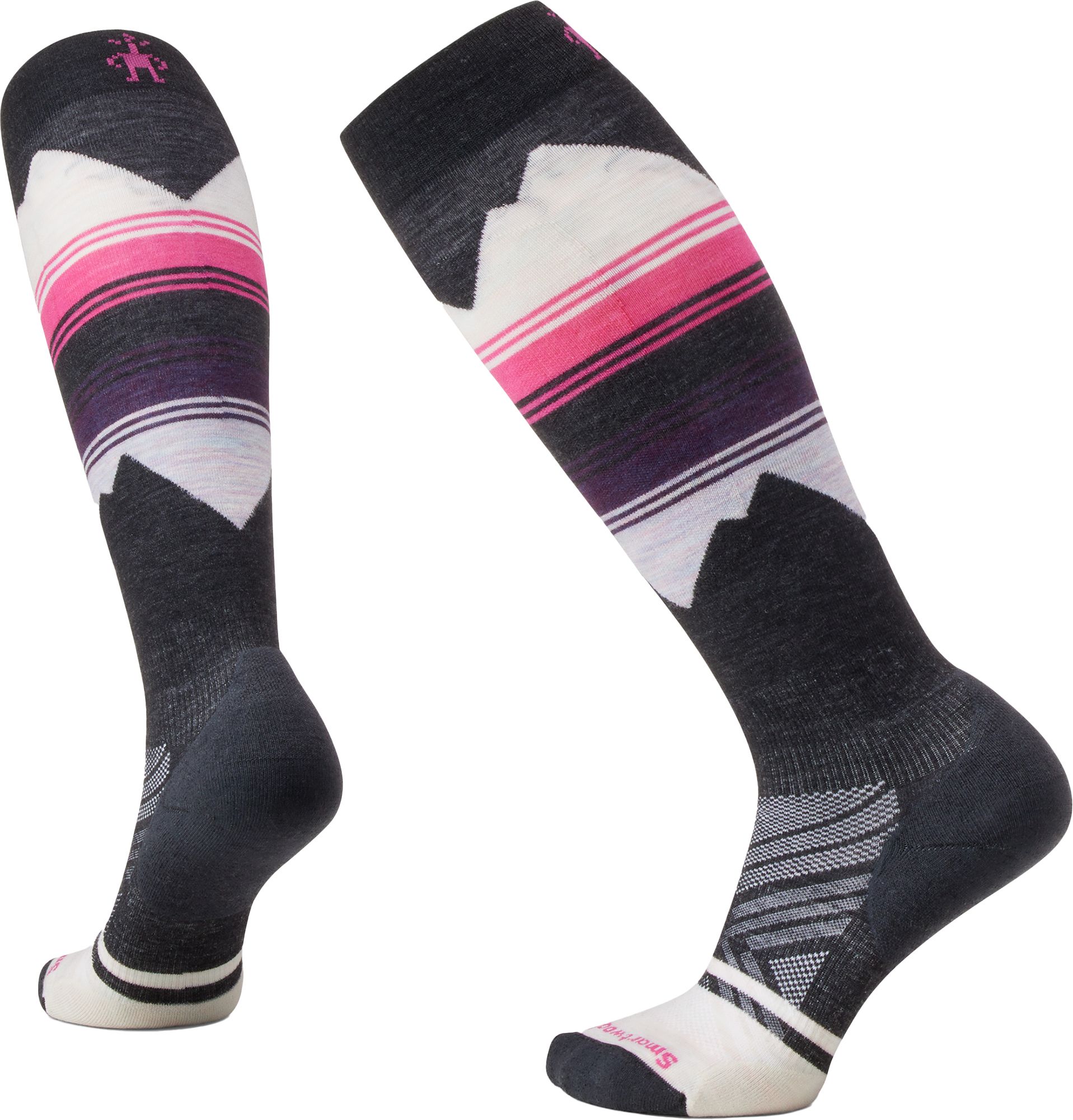Take on the slopes with a little style and a lot of comfort with the Women's Ski Targeted Cushion Pattern Over The Calf Socks. These Merino ski socks feature a vibrant mountain print, our most advanced Indestructawool technology for enhanced durability, and a 4 Degree elite fit system for an unmatched performance fit. Plus, body-mapped mesh zones for added breathability. Make a statement on the slopes this season with your new favorite performance socks.
