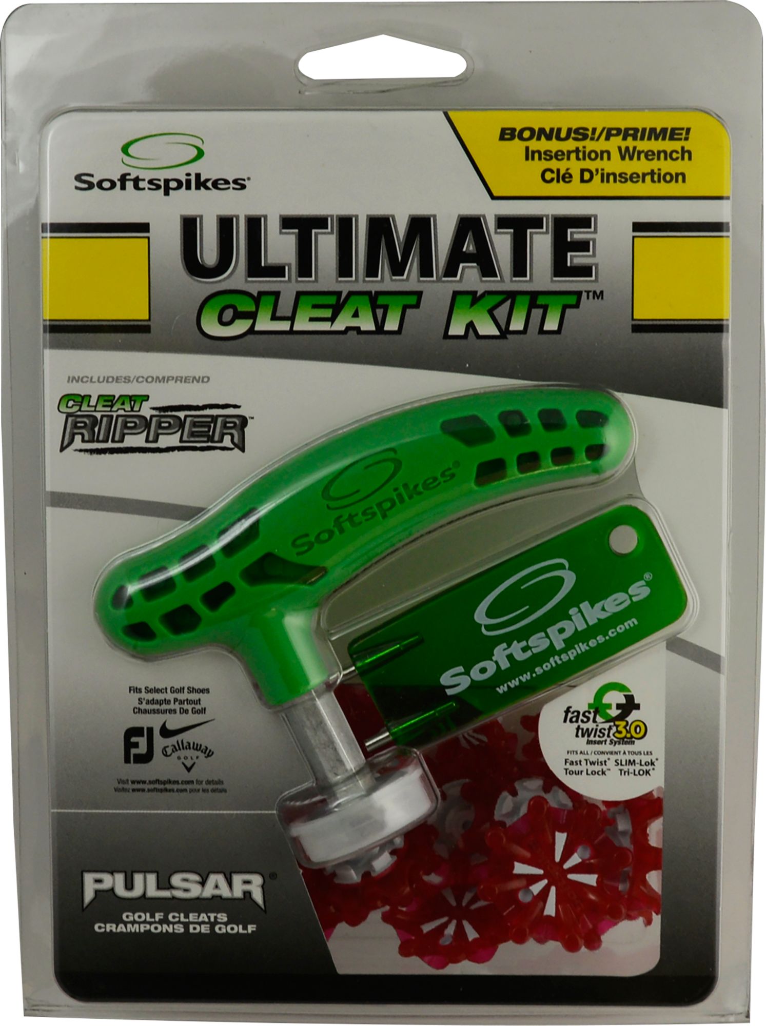 Revive your golf shoes this season with the Softspikes Ultimate Cleat Kit. Featuring a Softspikes Ripper Wrench, a two-prong insertion wrench and a full set of Pulsar Cleats, you’ll have complete traction on all terrains on the course.