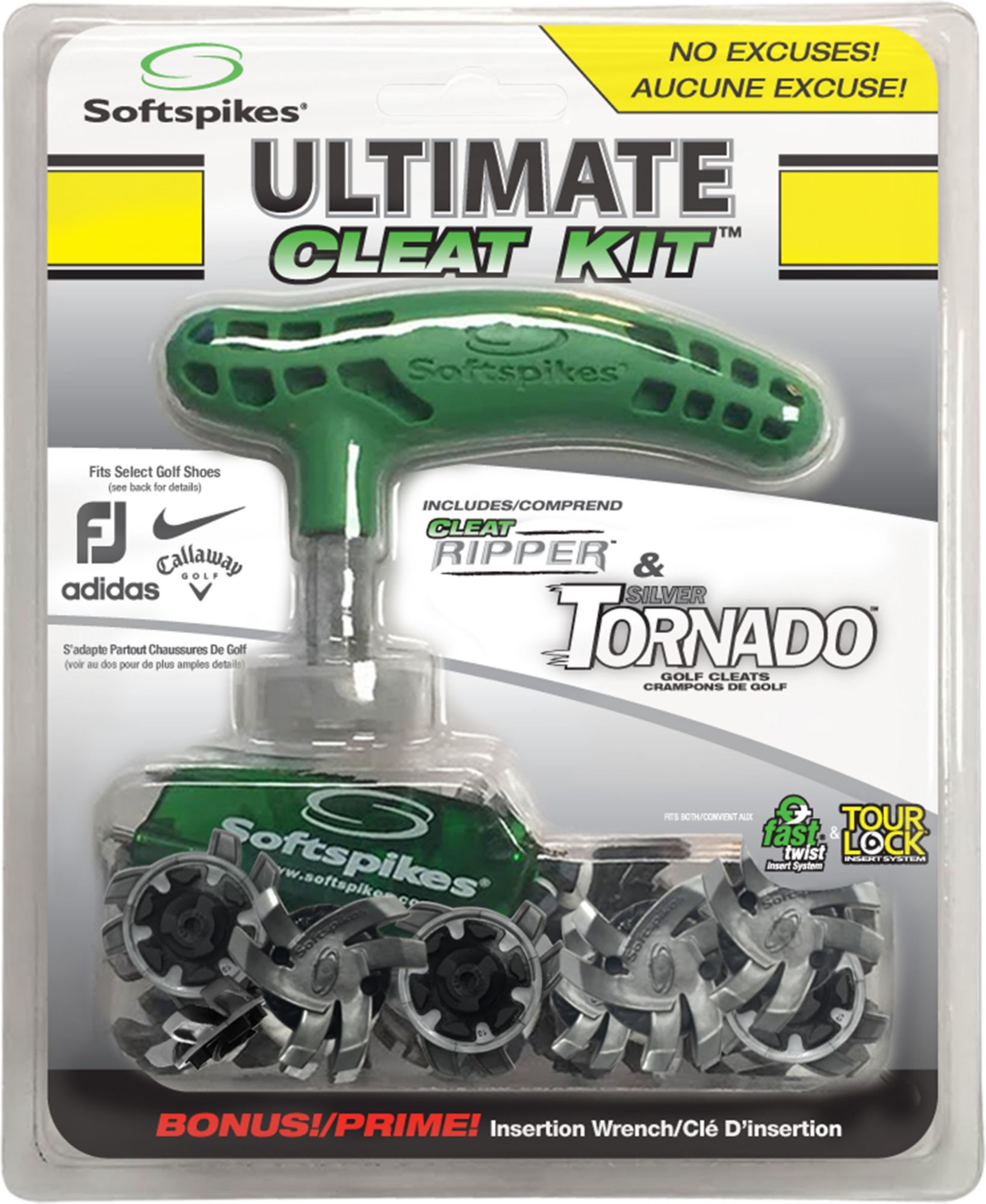 Equip yourself for any cleat situation that may occur during your game with the Softspikes Silver Tornado Tour Lock Ultimate Cleat Kit. This kit includes the Softspikes Cleat Ripper Wrench, a two-prong insertion wrench and one set of the Silver Tornado Tour Lock cleats. These cleats are engineered to provide enhanced traction and the flexible design maximizes green friendliness.