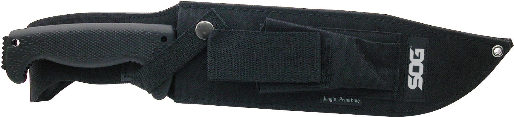 The SOG® Knives Jungle Primitive Knife is an all-purpose tool for survival around the camp or while hunting. Instantly use it as a small machete, hammer, or limb saw. The molded Kraton® handle features Digi-Grip™ and an aggressively curved front and back on the handle lessening the chance of slippage. The Jungle Primitive Knife includes a ballistic nylon belt loop sheath.