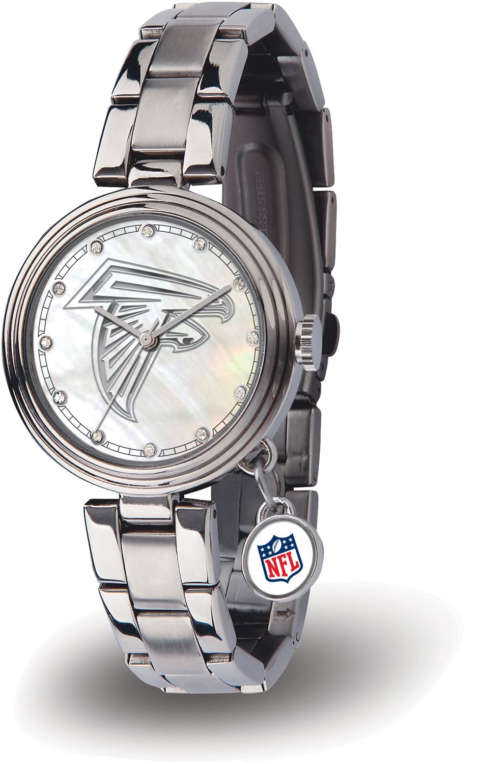 Score a touchdown for style with the Sparo® Atlanta Falcons Charm Watch. The dial of this fashionable watch features a team logo upon a silver-tone inlay background with a scratch-resistant mineral crystal lens. The stainless steel band adds a professional touch, while the dangling crystal charm allows for a feminine look at the game or office. Precision quartz movement on this quality piece ensures you’re always there for game time.